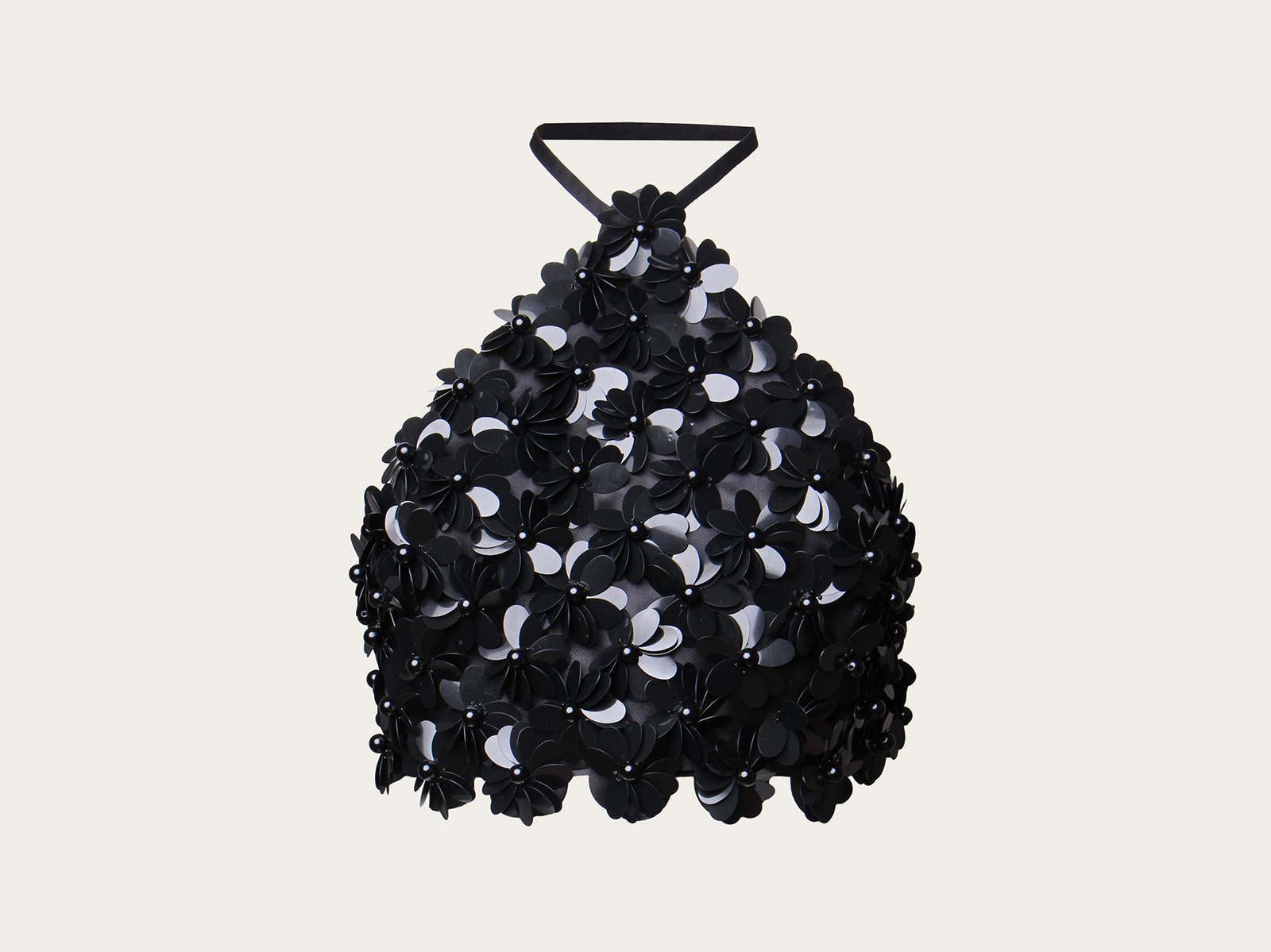 A dazzling bustier with a high neck and scalloped edges, fully adorned with handcrafted flowers, made with crystals and iridescent sequins. Pair it nicely with the ‘Gondole’ skirt.