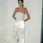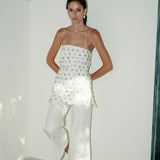 The 'Ecorces de cerisiers' bustier is cut from cotton linen, and elevated with hand-embroidered shell appliques. It is a form-fitting piece that goes perfectly with our 'Lula' skirt or 'Vera' pants.