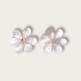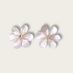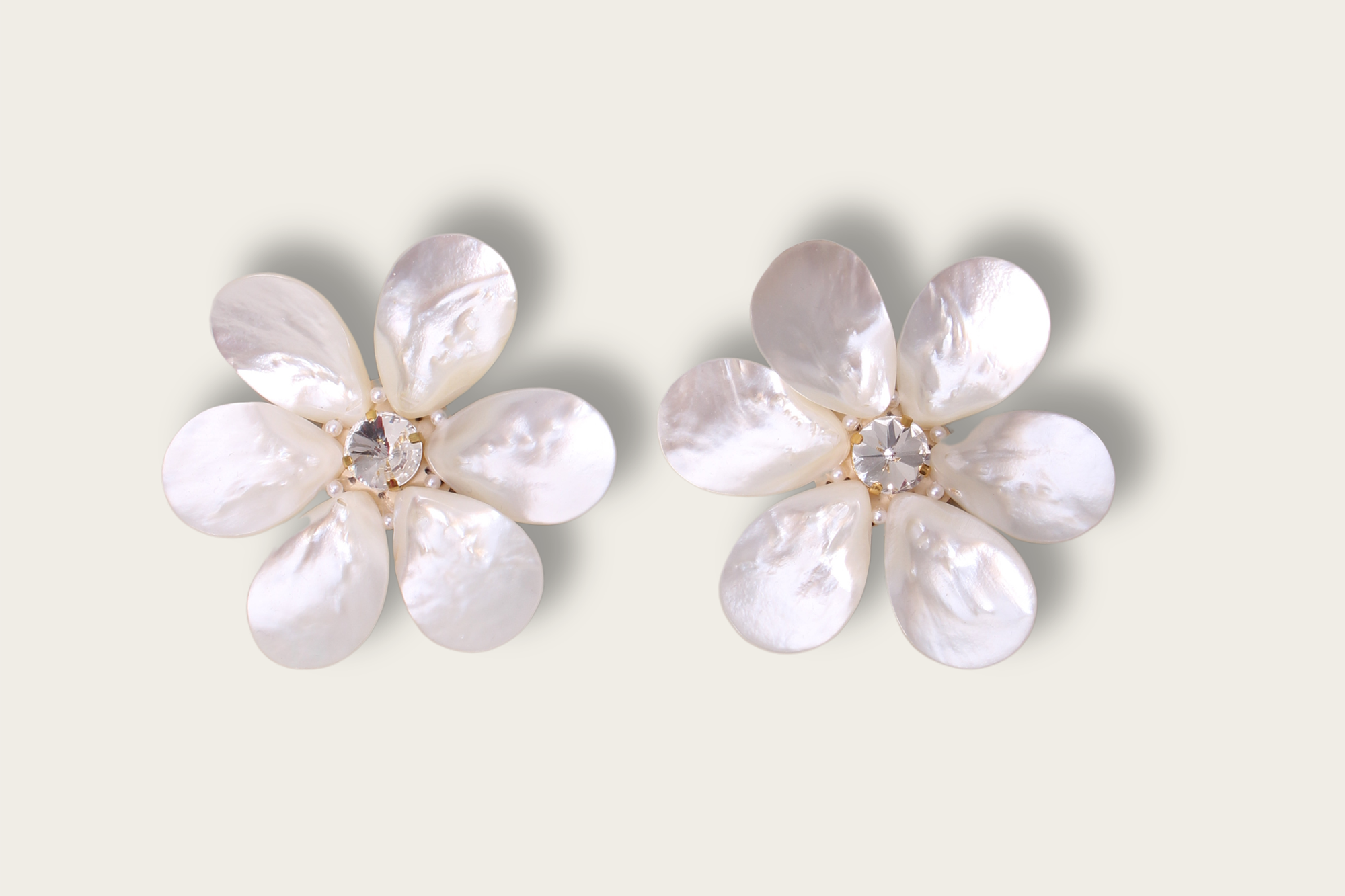 A fresh and feminine accent to your looks. Shaped delicately like a flower, these clip-on earrings are handcrafted with beaming crystals and natural pearly shells.