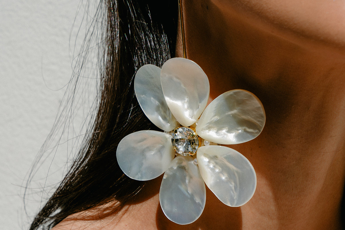 A fresh and feminine accent to your looks. Shaped delicately like a flower, this piece is handcrafted with beaming crystals and natural pearly shells.