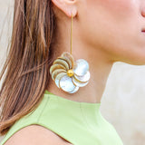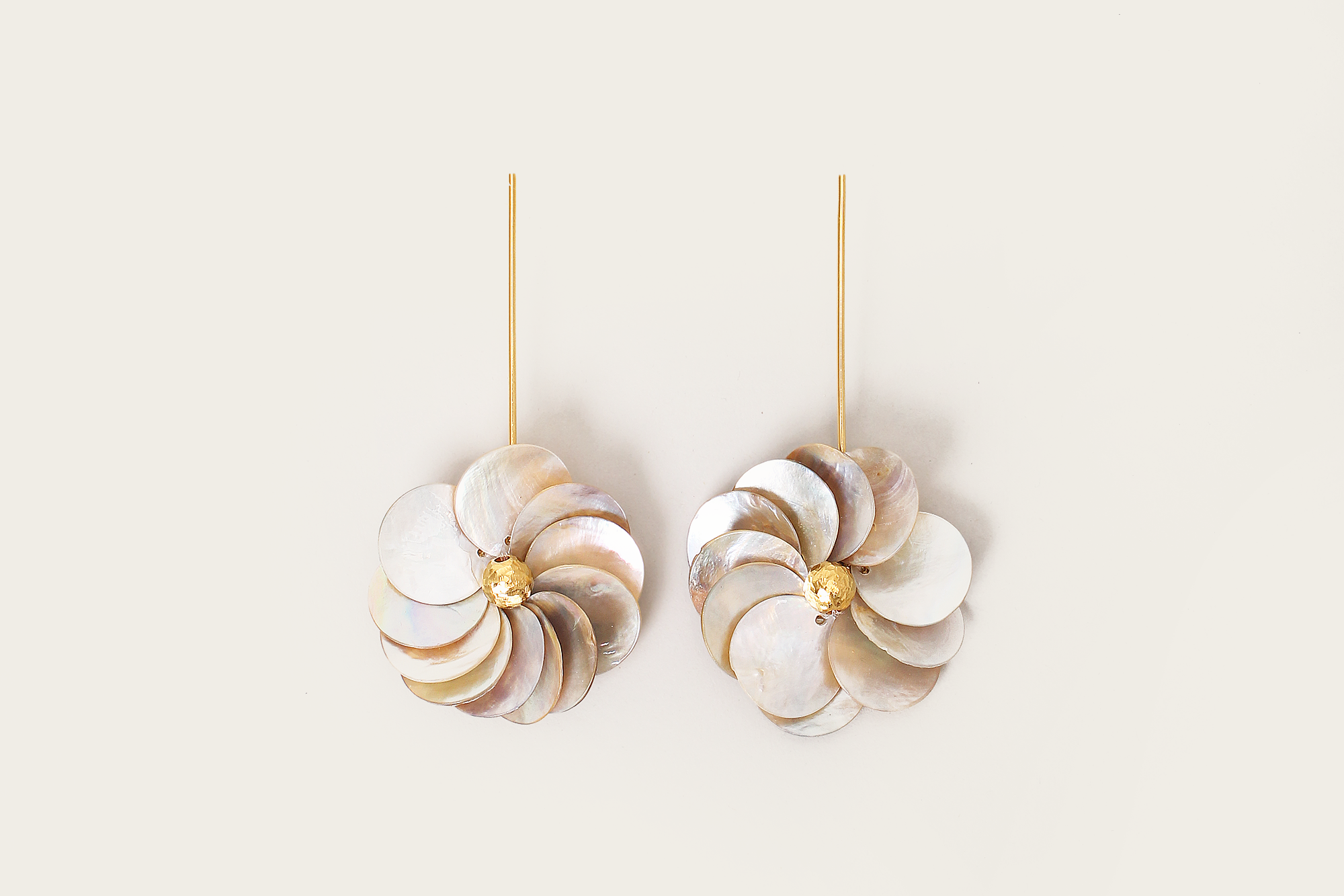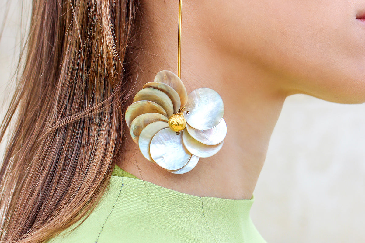 A Vanina signature design, this piece translates grace and allure. Entirely handcrafted from delicate natural shells and gold plated brass, these earrings will instantly add a statement to your looks.
