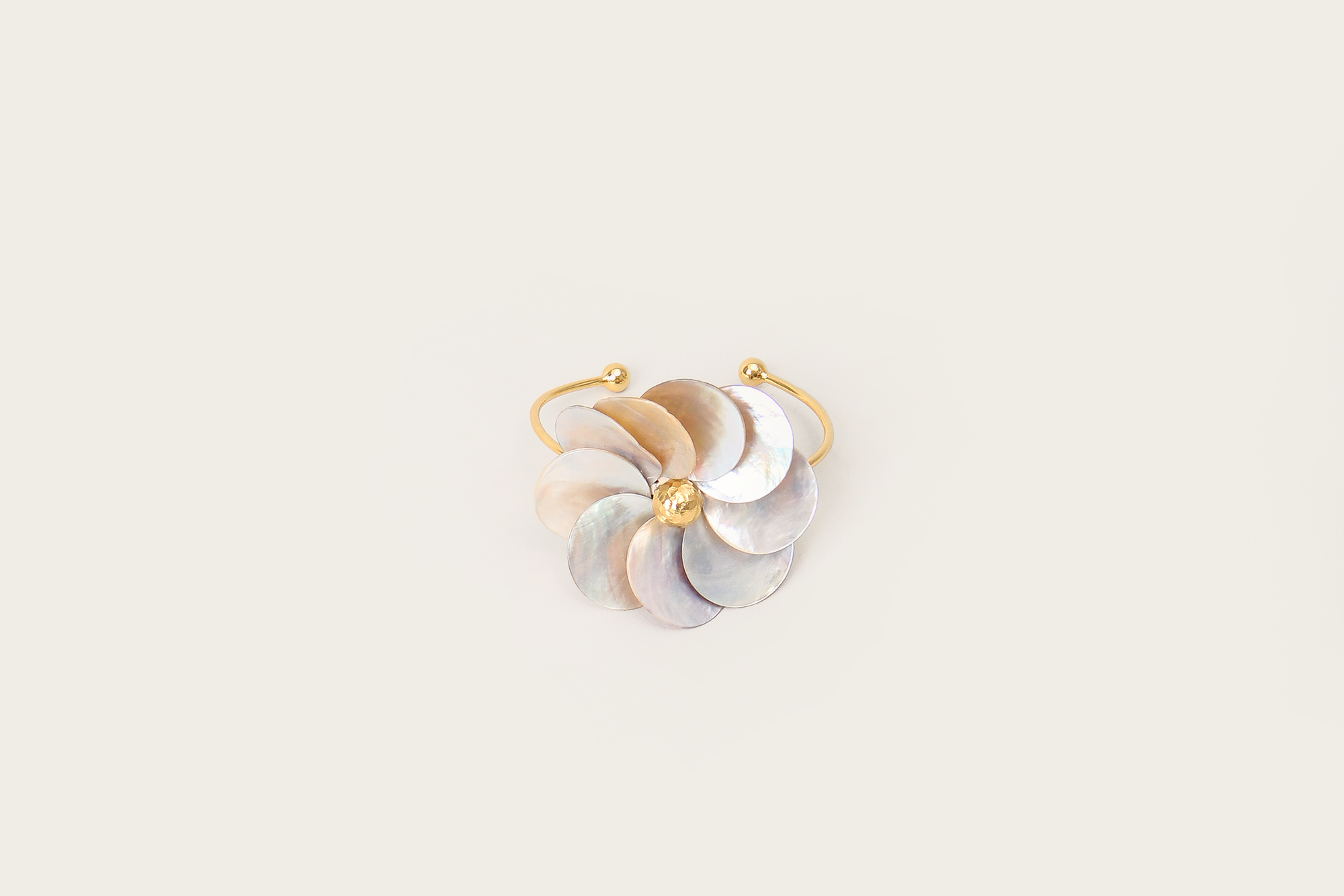 A Vanina signature design, this piece translates grace and allure. Crafted with an adjustable gold-plated base, it is embellished with a flower made from delicate natural shells.