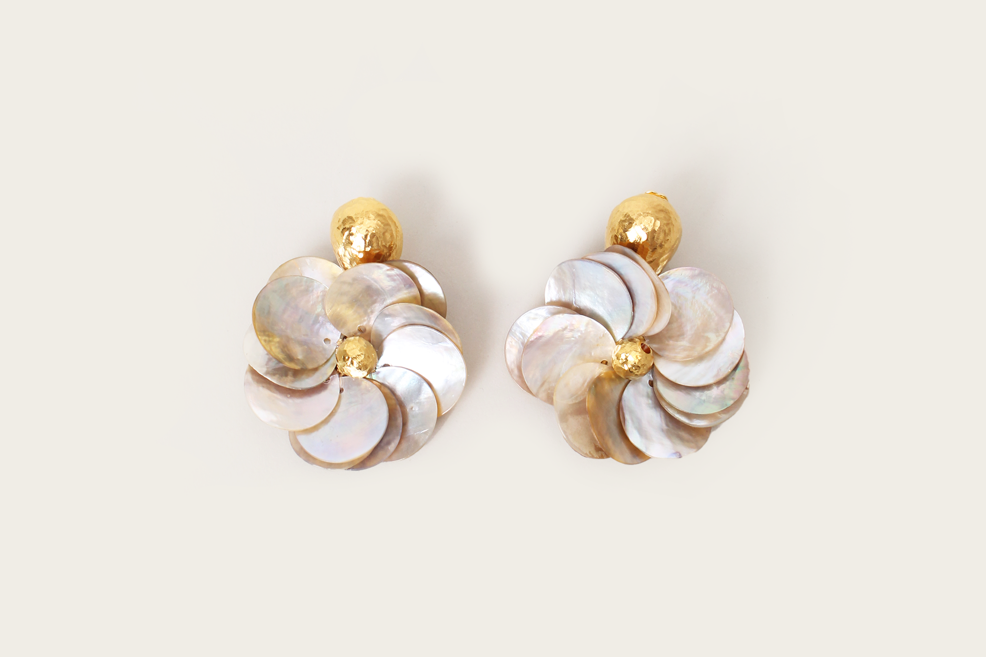 A Vanina signature design, this piece translates grace and allure. Entirely handcrafted from delicate natural shells and gold plated brass, these clip-on earrings will instantly add a statement to your looks.