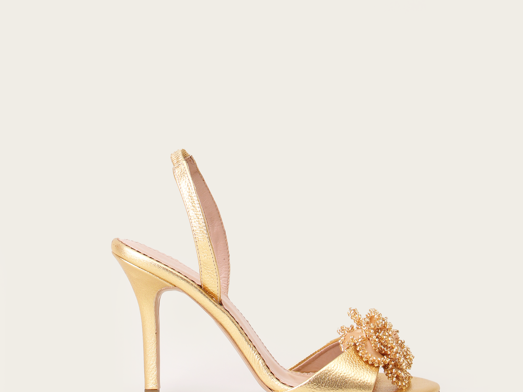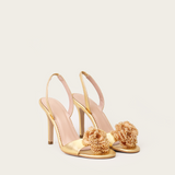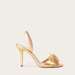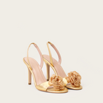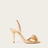A slingback open sandal, set on a sleek stiletto heel. Crafted with a soft textured leather, it is embellished with an oversized beaded rose, with intricate detailing.