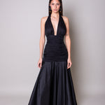 A refined piece that exudes elegance. Featuring hatlerstyle straps and with horiztonal pleating at the waist, it is emphasized by a bell-shaped skirt.