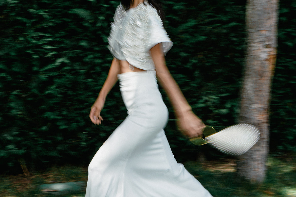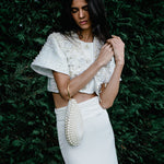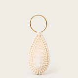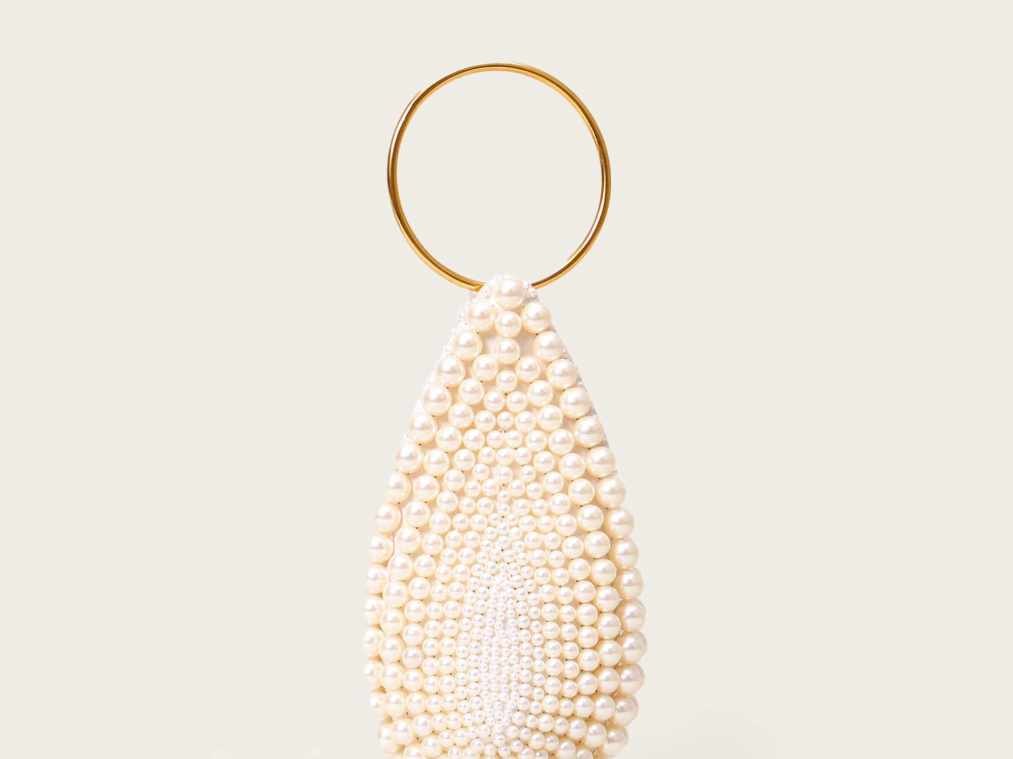 A teardrop-shaped bracelet bag exuding elegance and sophistication. It is encrusted with glossy acrylic pearls in different sizes and topped with a circular gold-plated handle.