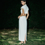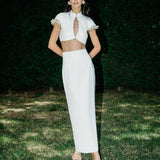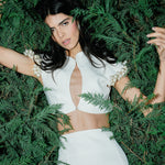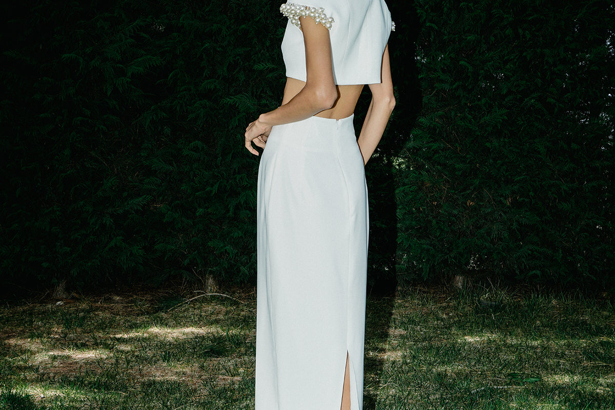 A cropped top with a mandarin collar and a keyhole detail. It is emphasized by dangling pearls on the sleeves, adding more refinement and charm.