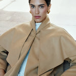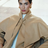 Crafted with soft wool, this cape-style jacket comes with an open collar and broad lapels, creating an oversized look.