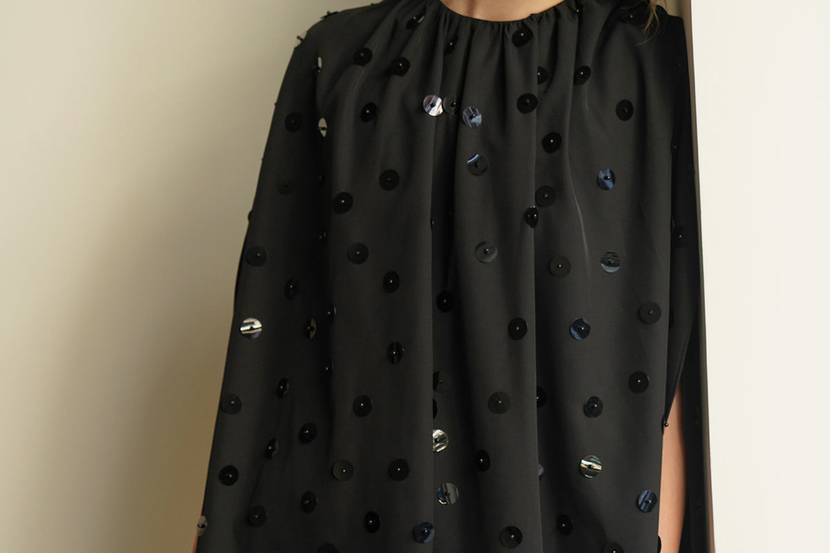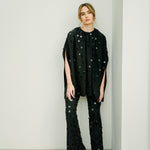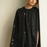 This sequined set features a modern design with a playful touch. The top is an oversized, draped cape-like piece that gathers at the neckline, creating soft, voluminous folds that flow elegantly.