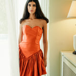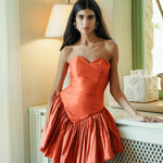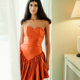 An ideal mini dress with a flirty edge. It features a sweetheart neckline with a corseted bodice and a gathered ruffled asymmetrical skirt.