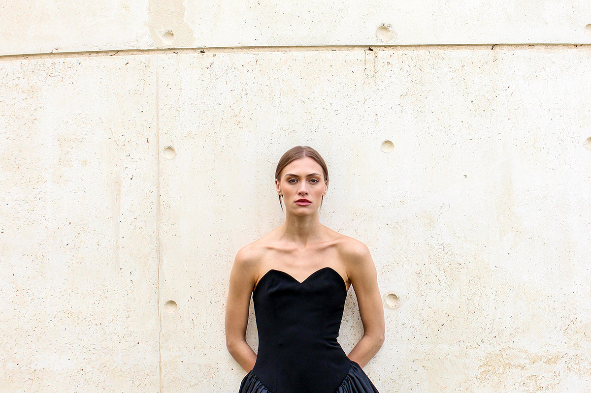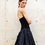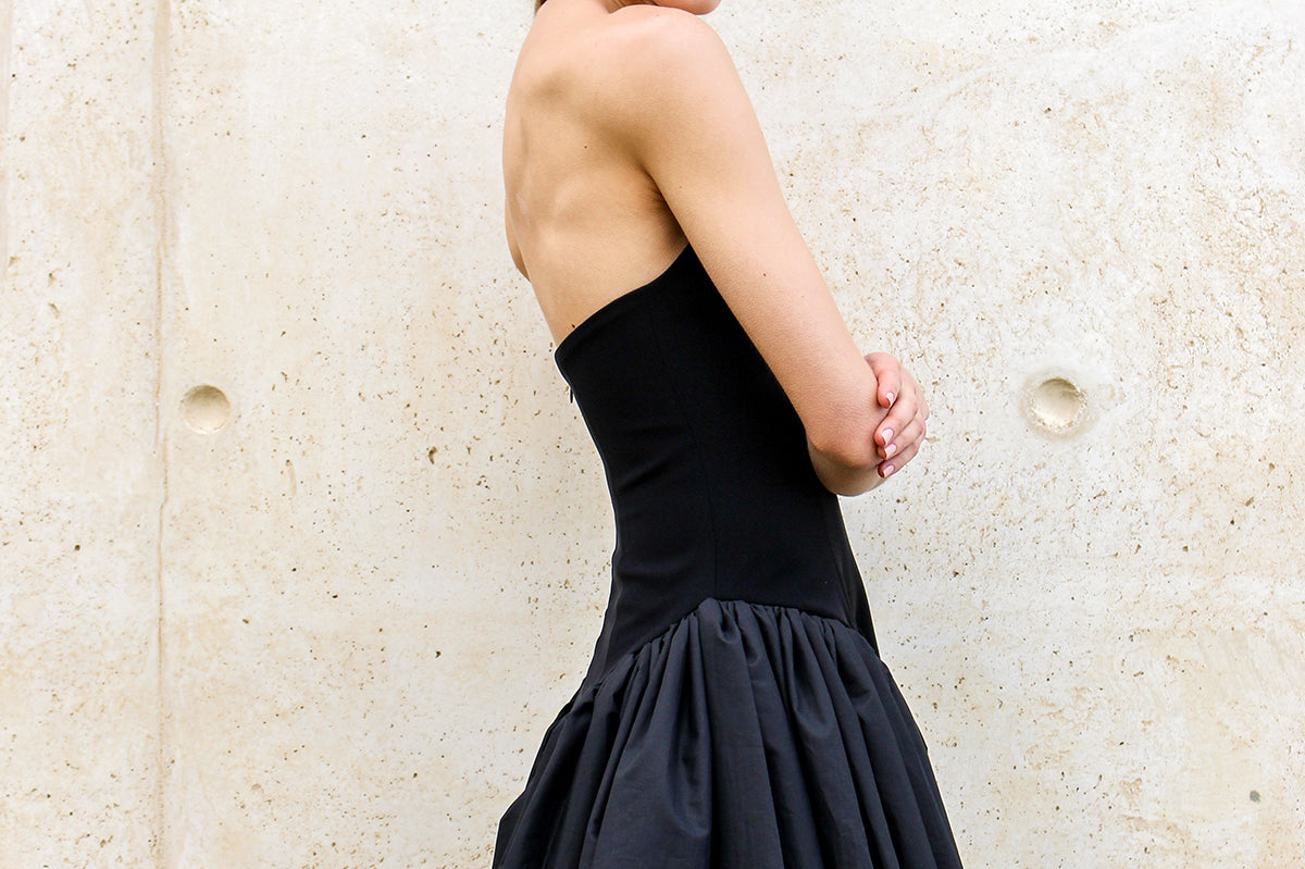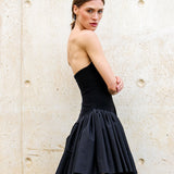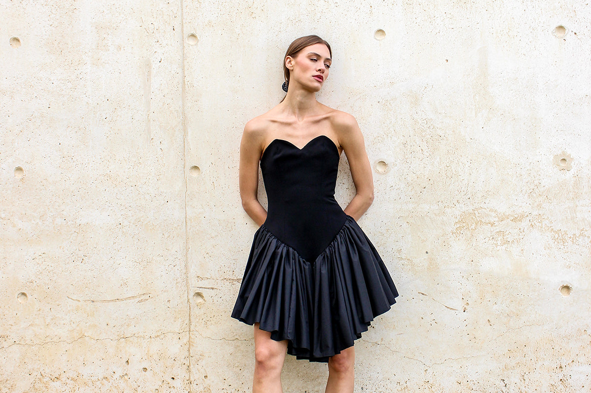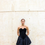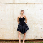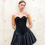 An ideal mini dress with a flirty edge. It features a sweetheart neckline with a corseted bodice and a ruffled asymmetrical skirt.