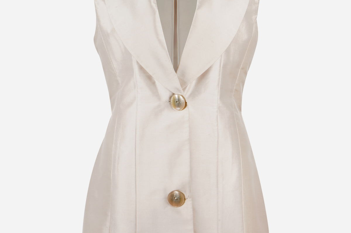 A trans-seasonal vest that caters to every look. This suiting-inspired piece hits below the waist with a rounded collar and oversized buttons.