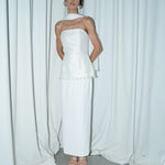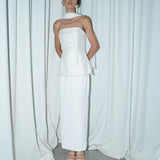 The 'Lula' bustier with the matching shawl will definitely add a soft and feminine flare to your look. This set is adorned with pearls at the hem and can be perfectly matched with our 'Mary' flared pants. .