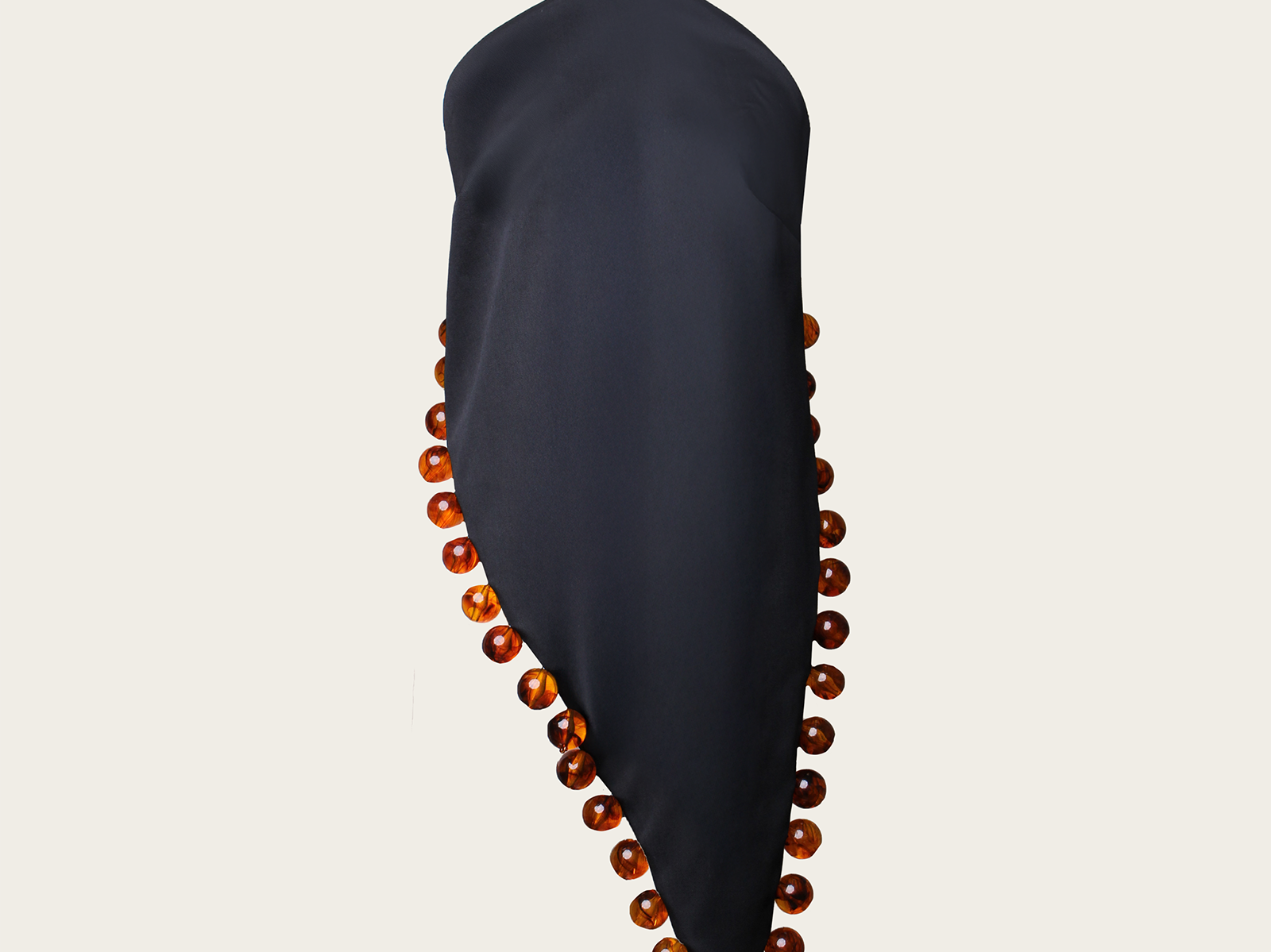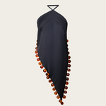 A halter-top with asymmetric detailing, adorned with oversized tortoise beads and a completely open back. It is tied around the neck and back with drawstrings.