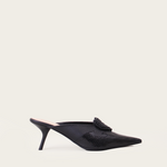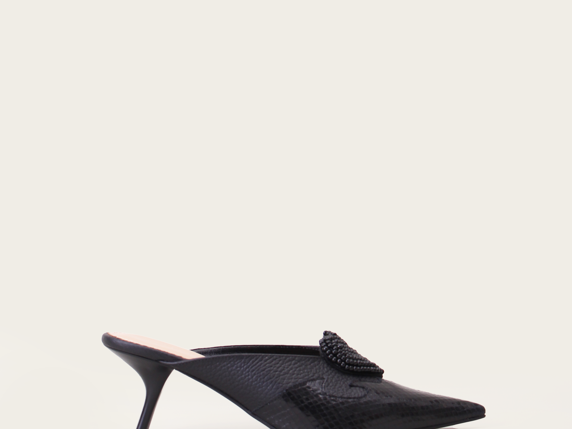 A western-inspired leather mule adorned with a beaded heart, featuring an angular heel. The two-toned color scheme with textured and smooth leather detailing add a striking contrast.