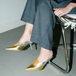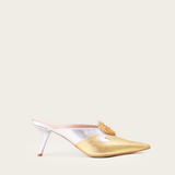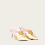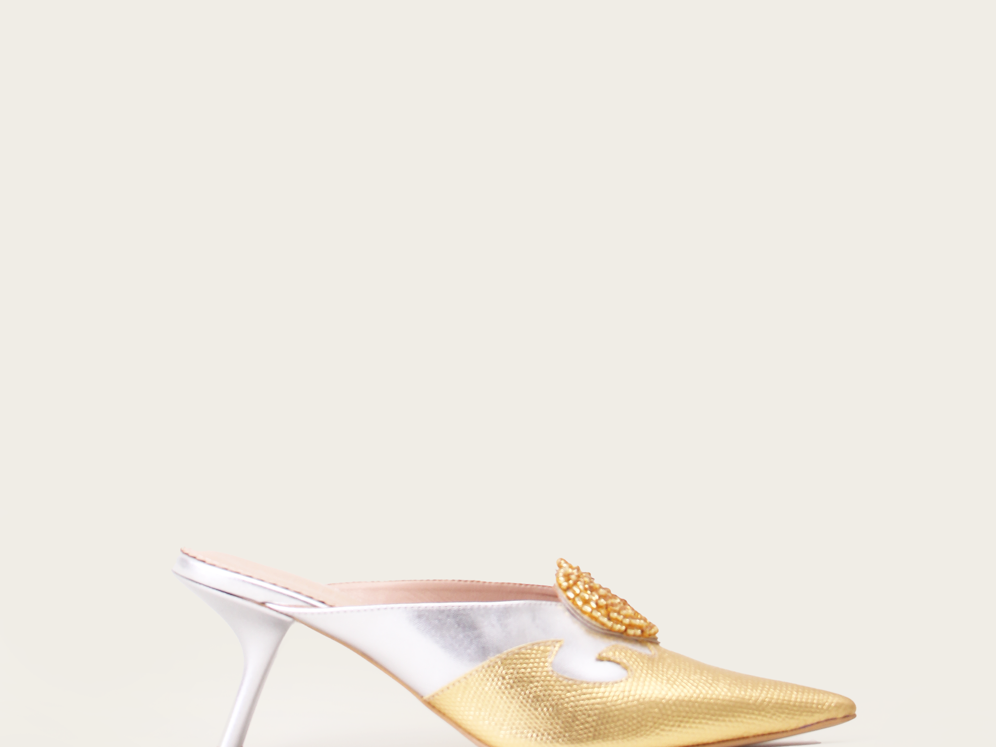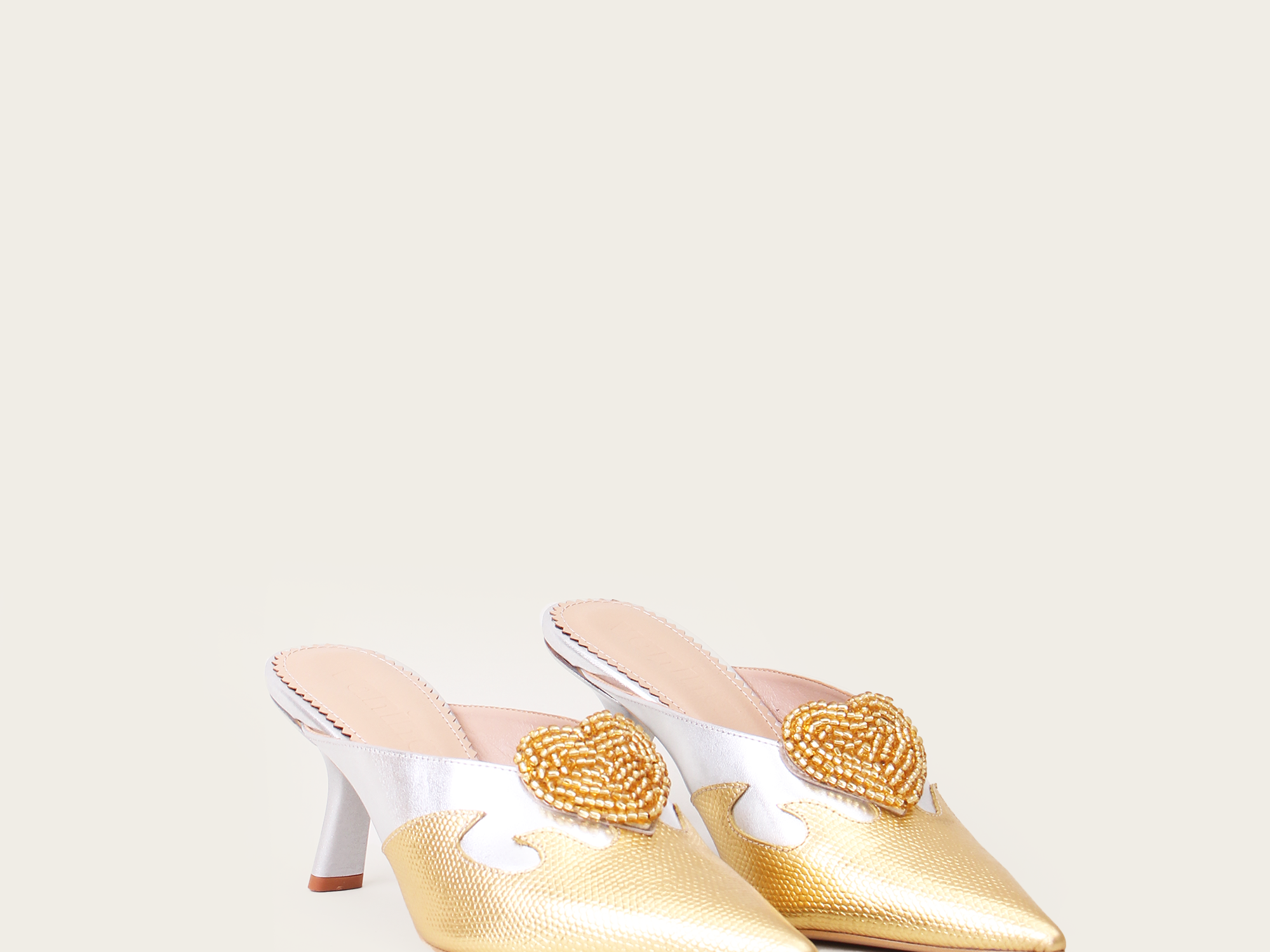 A western-inspired leather mule adorned with a beaded heart, featuring an angular heel. The two-toned color scheme with textured and smooth leather detailing add a striking contrast.
