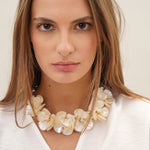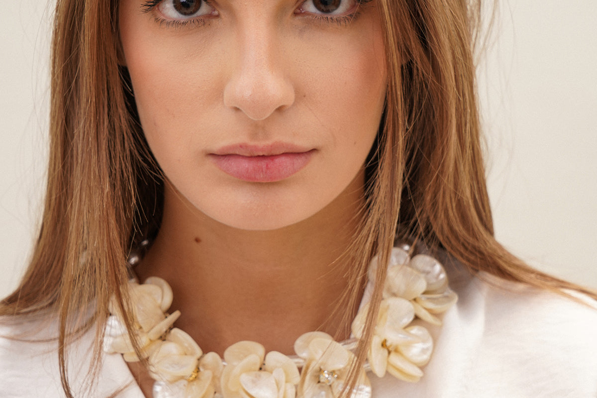 A fresh and feminine piece that will embellish your neck. Our 'fleur blanche' necklace is crafted with crystals and natural shells, delicately shaped like flowers.