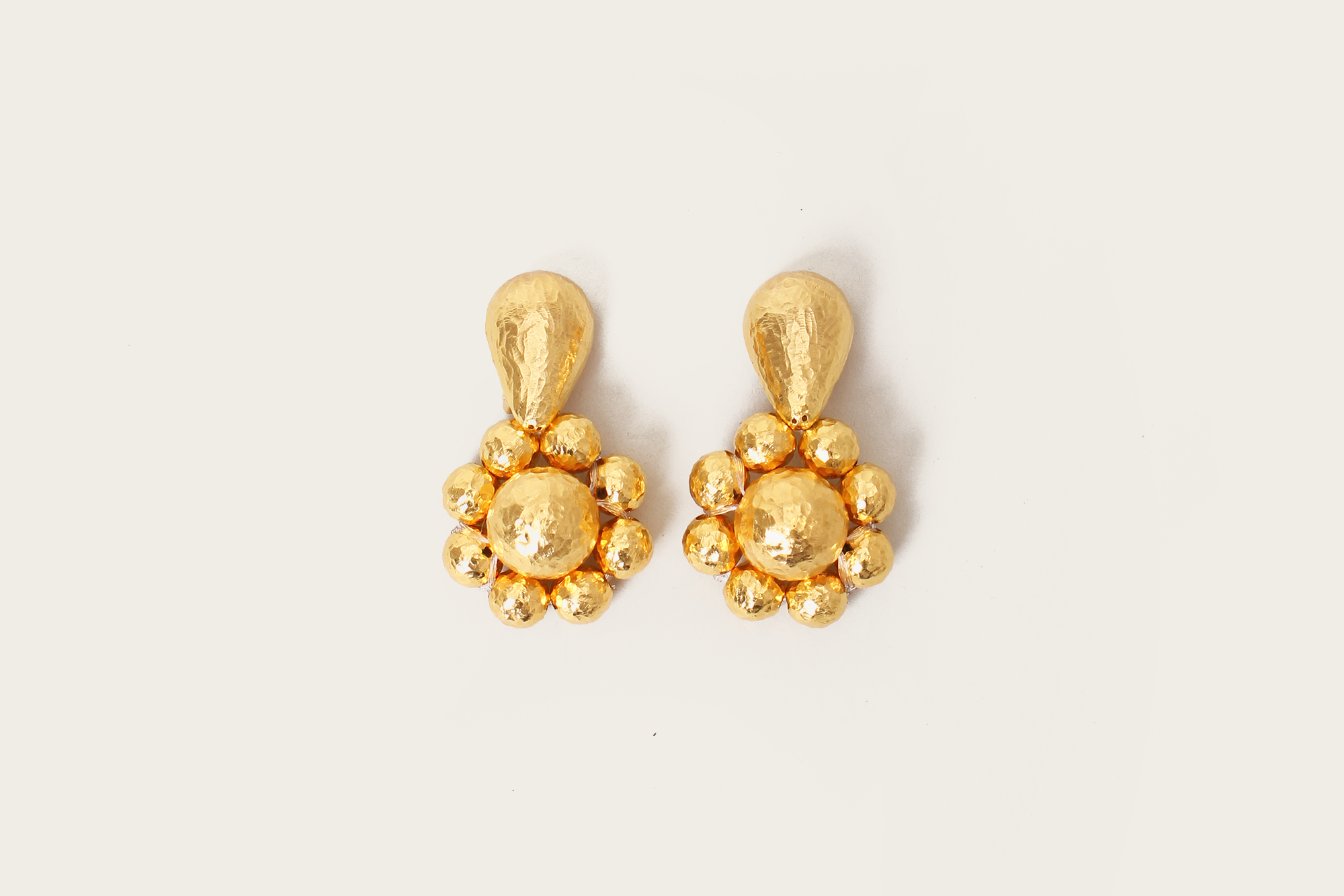 This clip-on piece is a gold-plated tear drop shape with a foil finish.