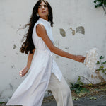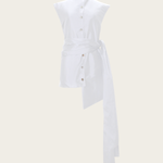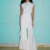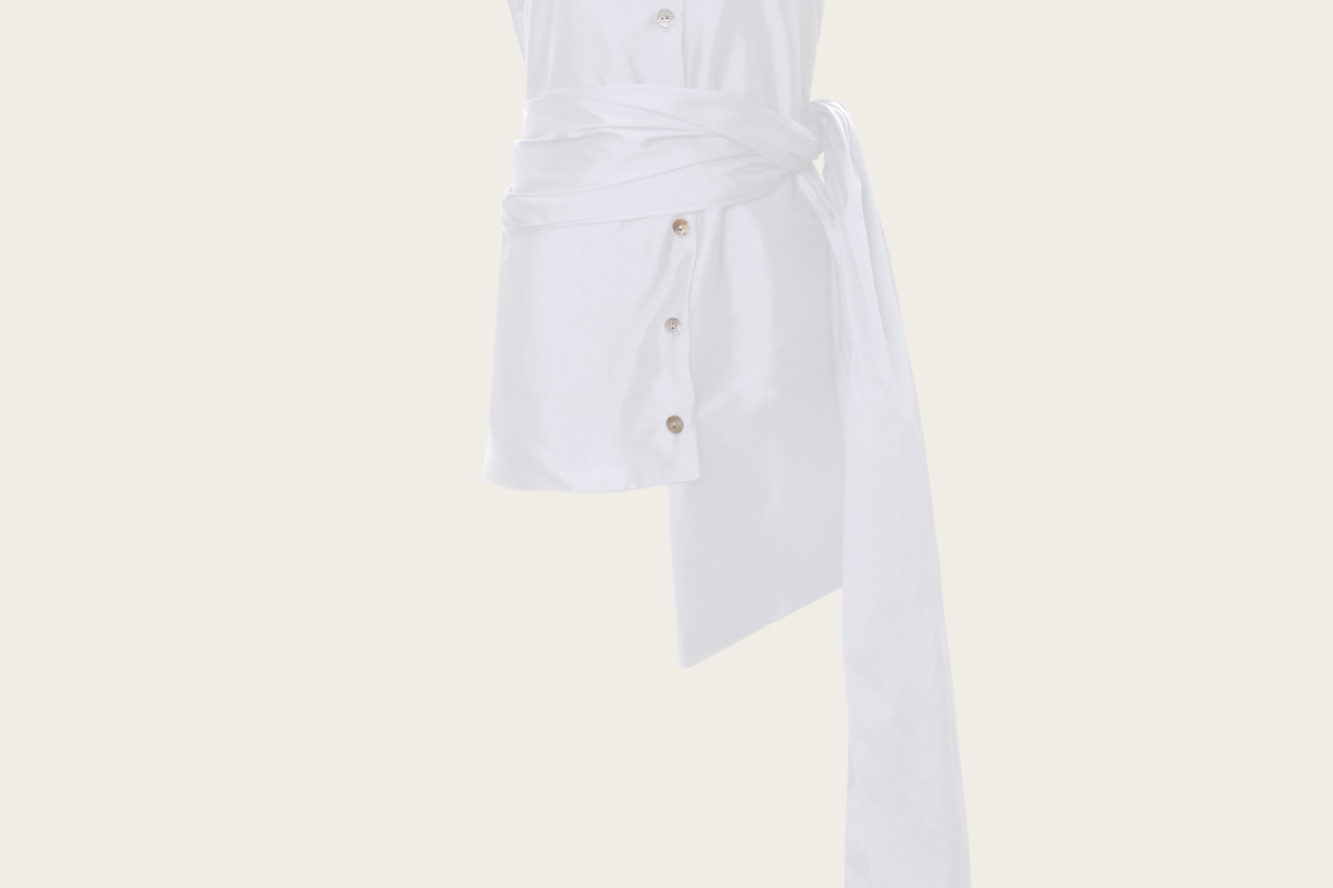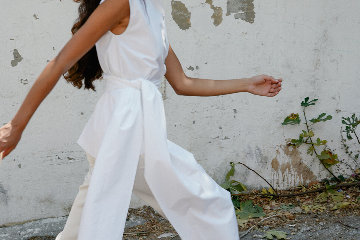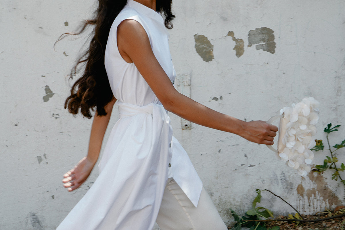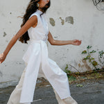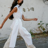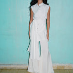 This shirt features a structured, sleeveless cut with a high, mandarin collar for a polished, refined look. The oversized wrap-around sash that ties at the waist drapes elegantly. Pair it with the flared 'Tanya' pants.