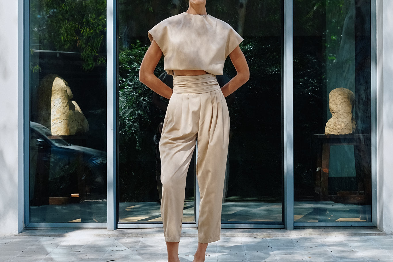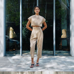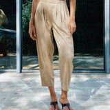 These harem-style pants create a voluminous silhouette, sitting high on the waist with a cropped hem and pleated details at the waist.