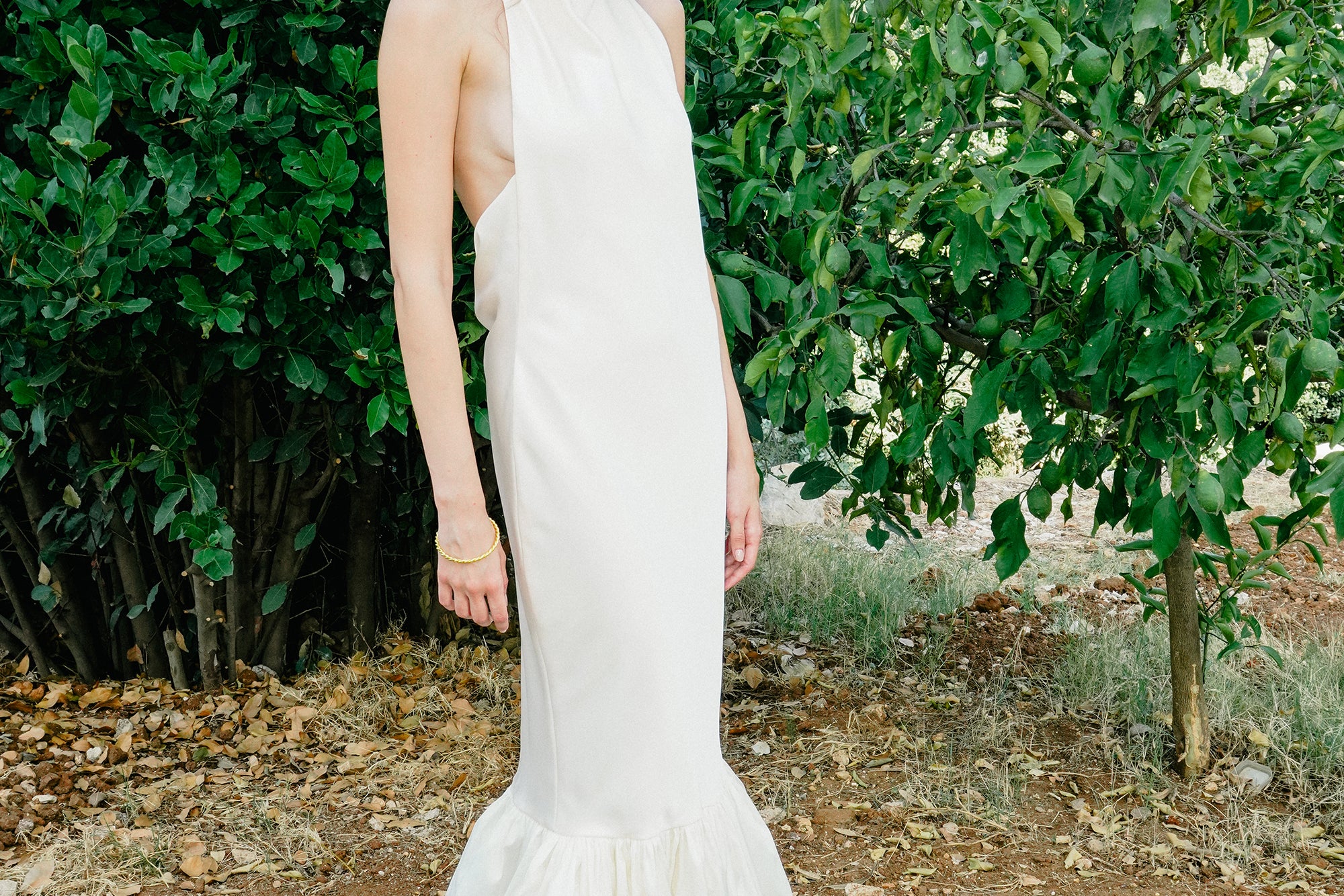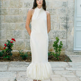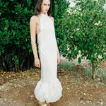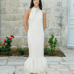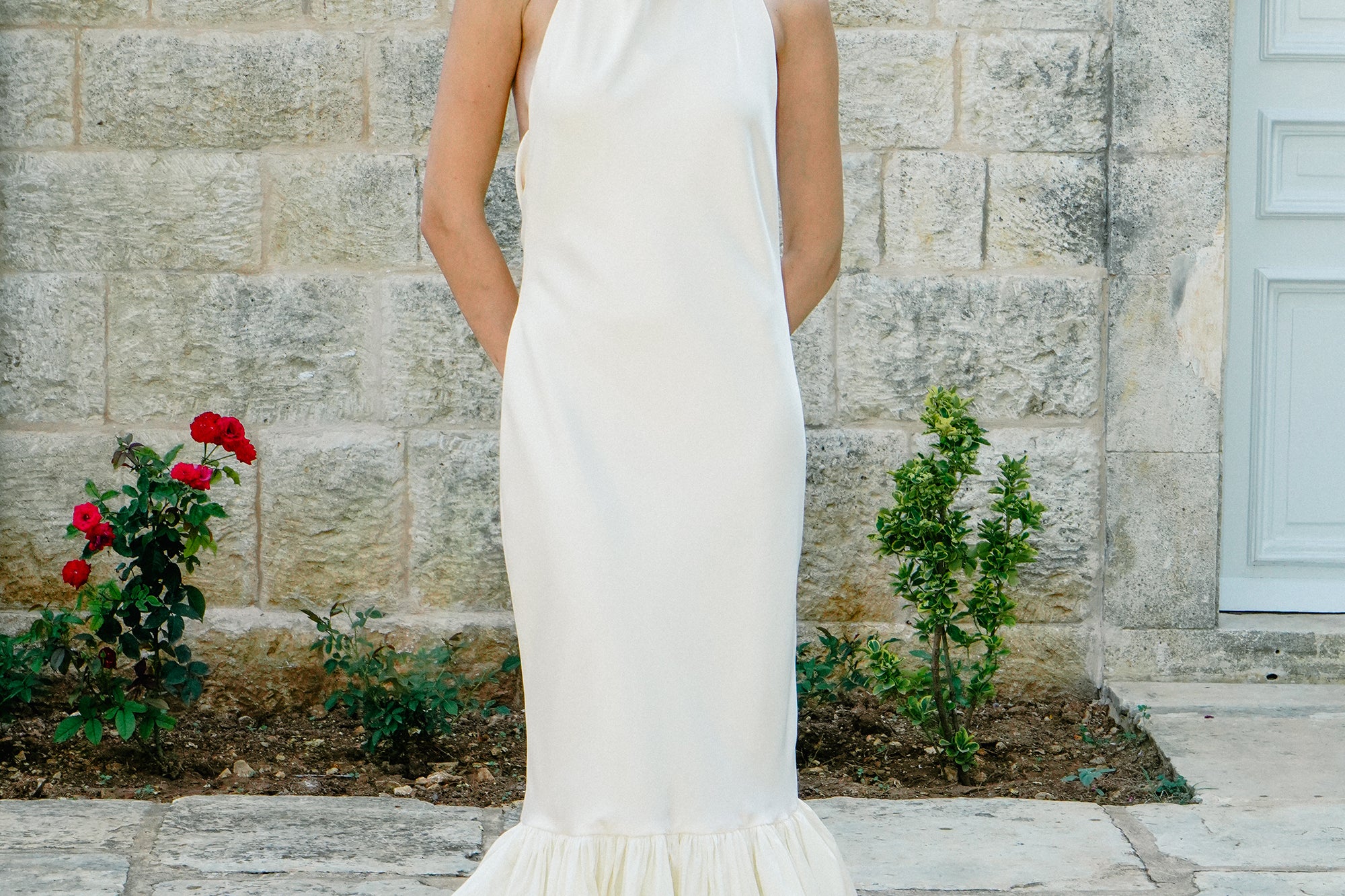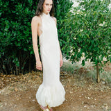 The 'Parasol' dress is a high-neck draped cut with an open back and a ruffled hem. It is cut from light satin and silk taffeta.