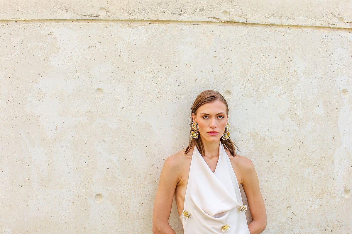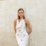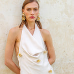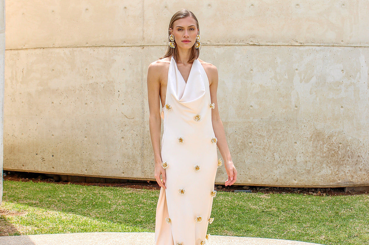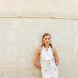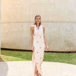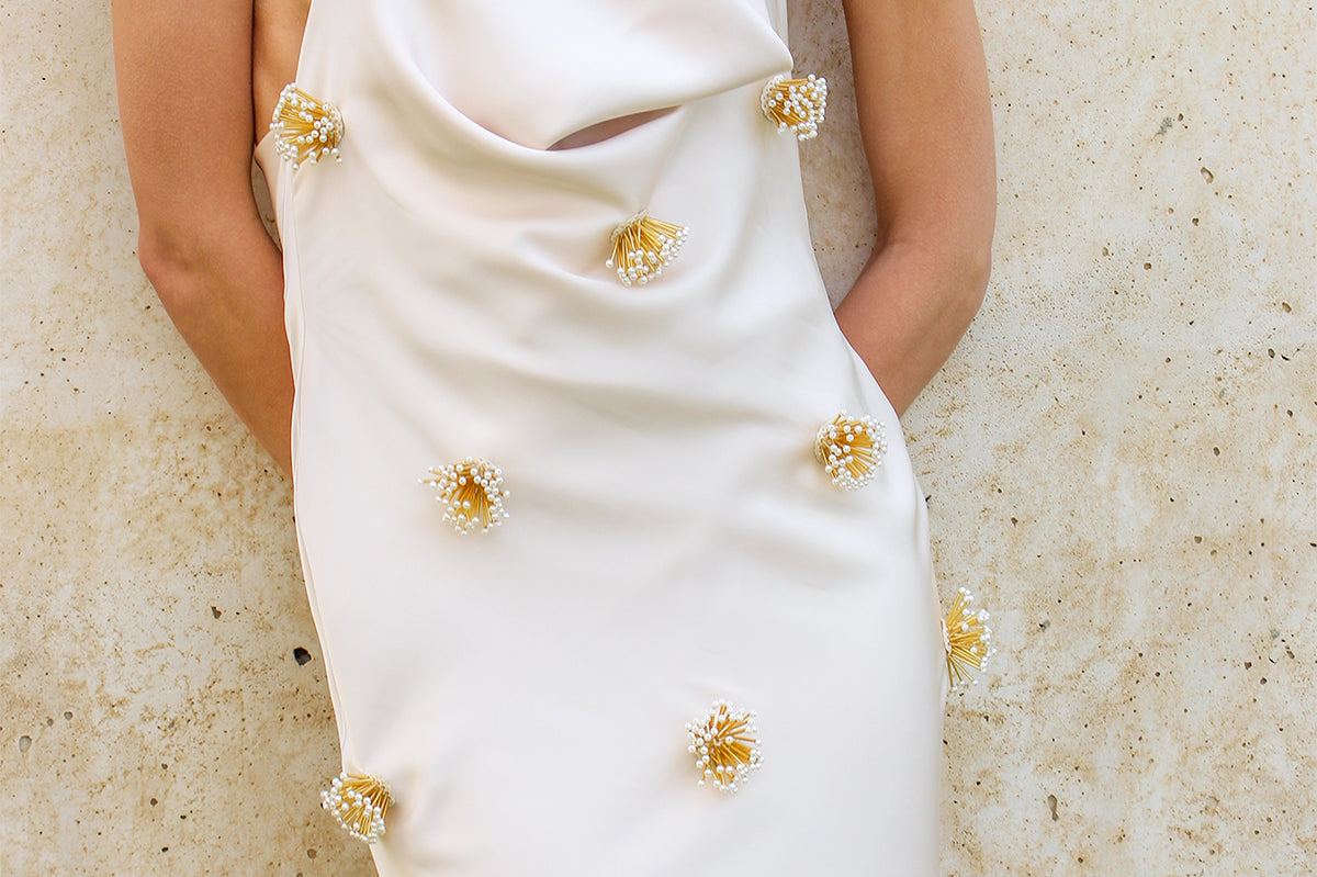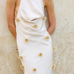 A long maxi slip dress with a deep cowl neck and low drapped back. The 'Pissenlits' dress is adorned with scattered beaded dandelions, creating the most refined and flattering silhouette, .