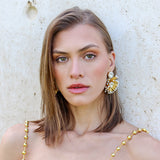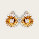 A beaded flower that take your looks to next level. These rich and statement earrings are crafted with shiny gold-plated cylinders and pearly acrylic beads.