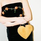 An endearing heart-shaped piece, adorned entirely with glass beads and topped with gold-plated circular handle. Meticulously handcrafted, this beaded elevates any outfit with a touch of loving charm.