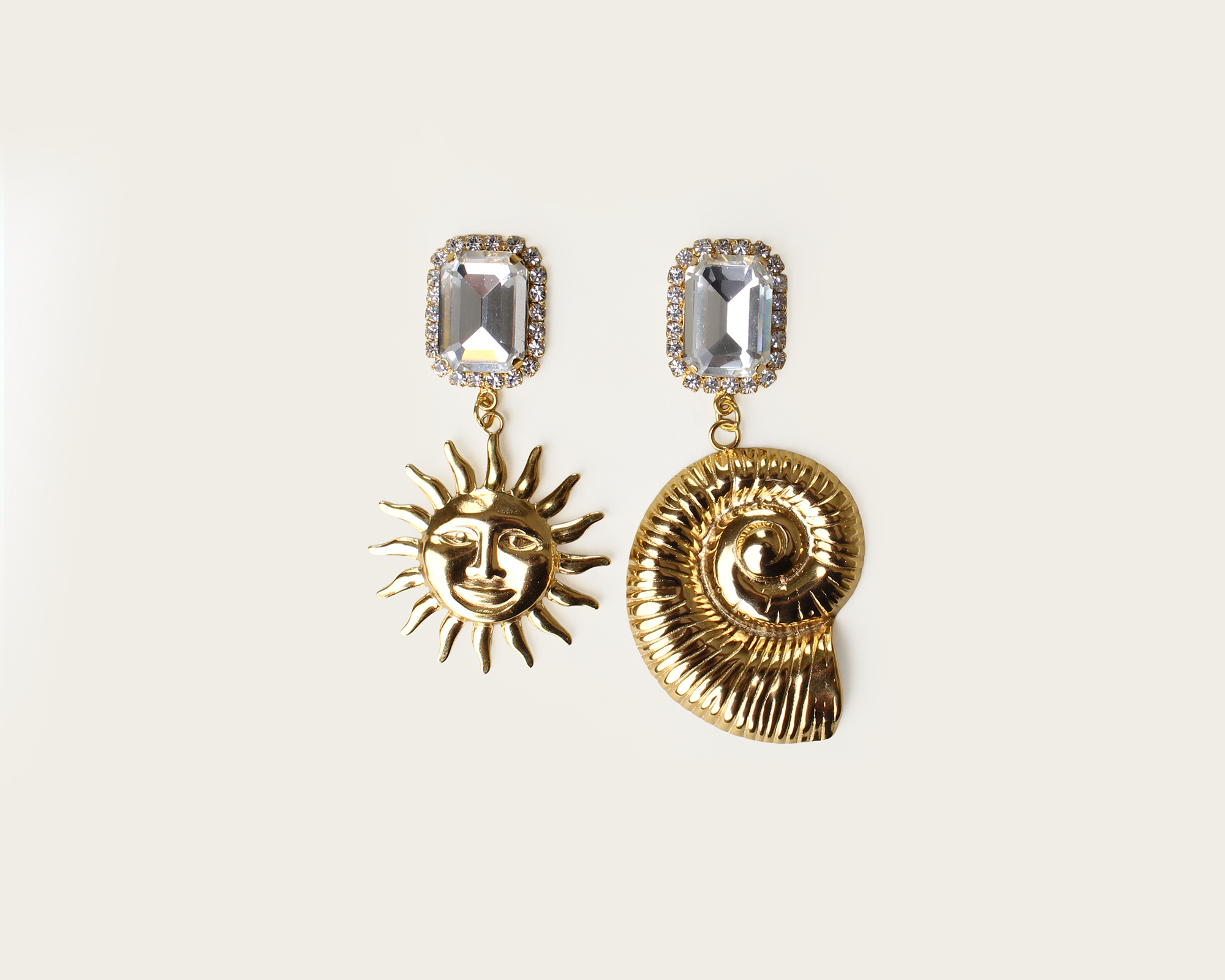 Statement mismatched earrings with a tropical sun and a sea shell.