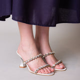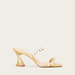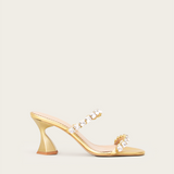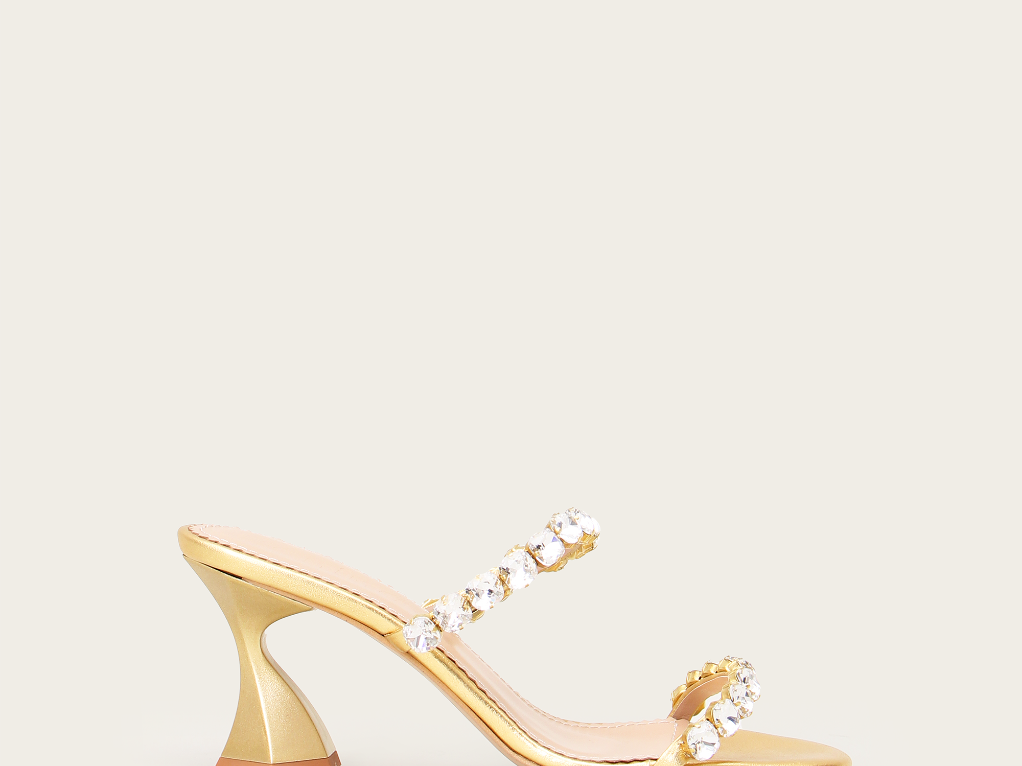 A statement pair with a structured heel, these double-strap elegant sandals are fully adorned with dazzling crystals. A sparkly addition to your evening looks.