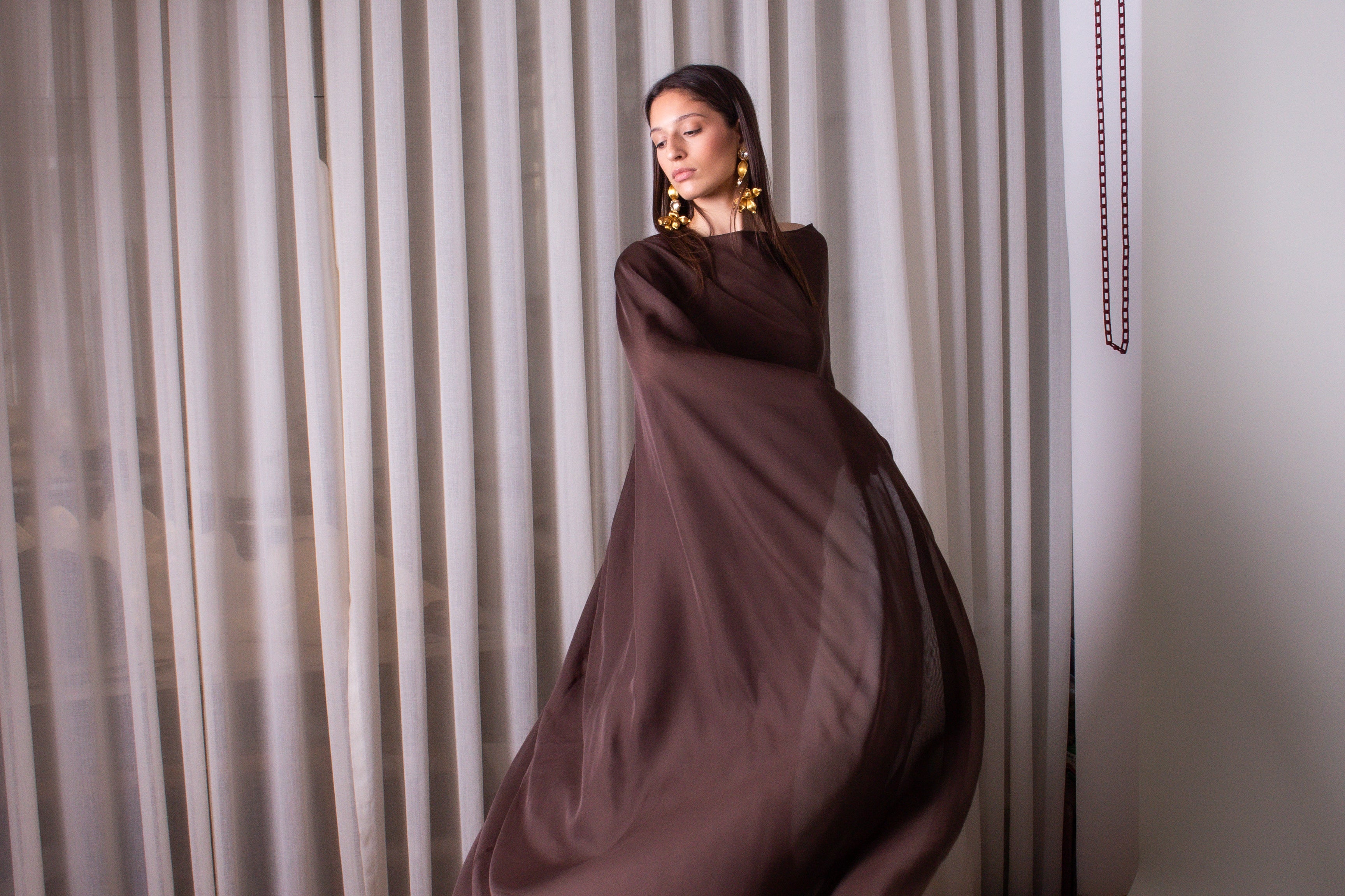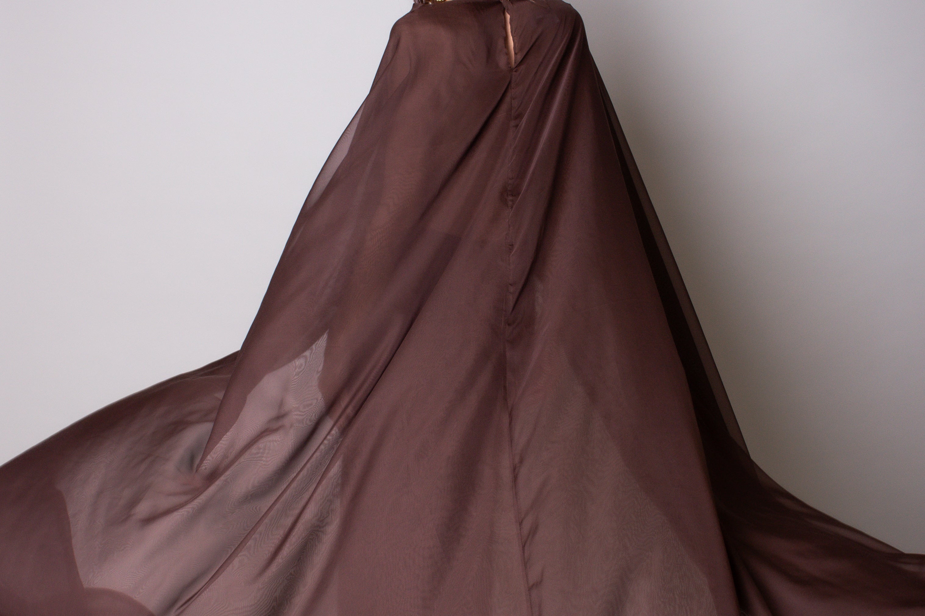 A refined set crafted with an airy mousseline material. It features an asymmetrical off-the-shoulder poncho and a long flowy skirt.