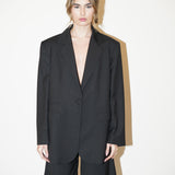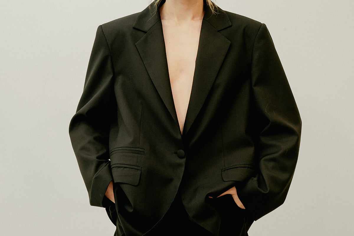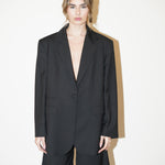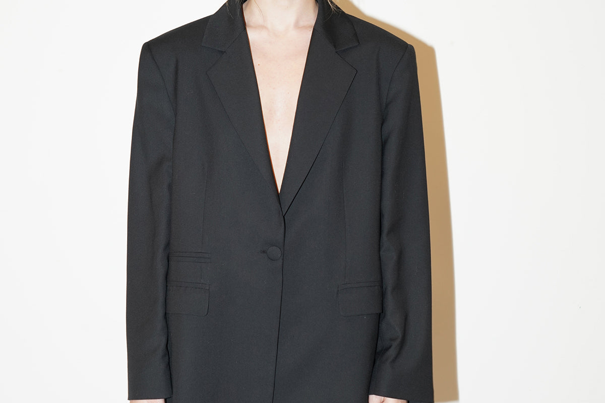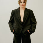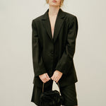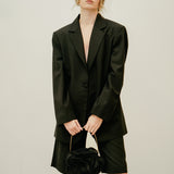 A tailored set featuring oversized bermuda shorts and a structured blazer, crafted with a light mid-seasonal fabric.