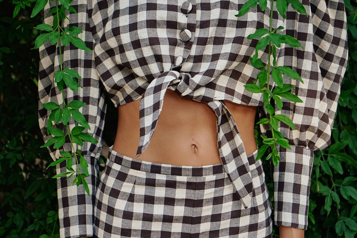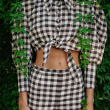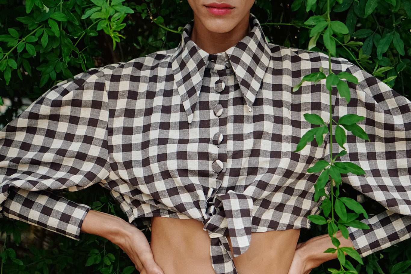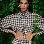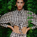 A piece that can be easily worn from day to night. This cropped shirt comes with a front knot, a large collar, and wide cuffs for more edge.
