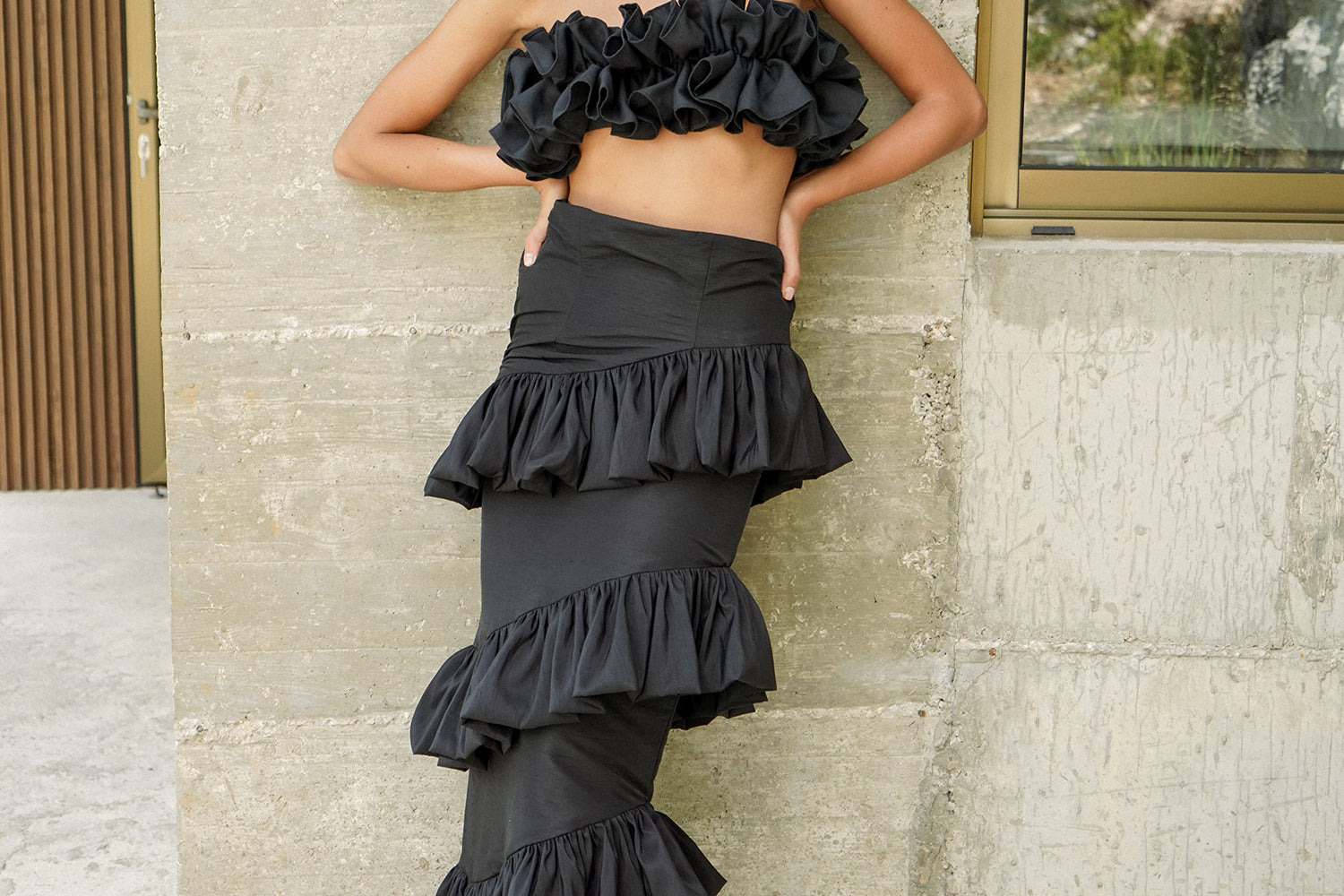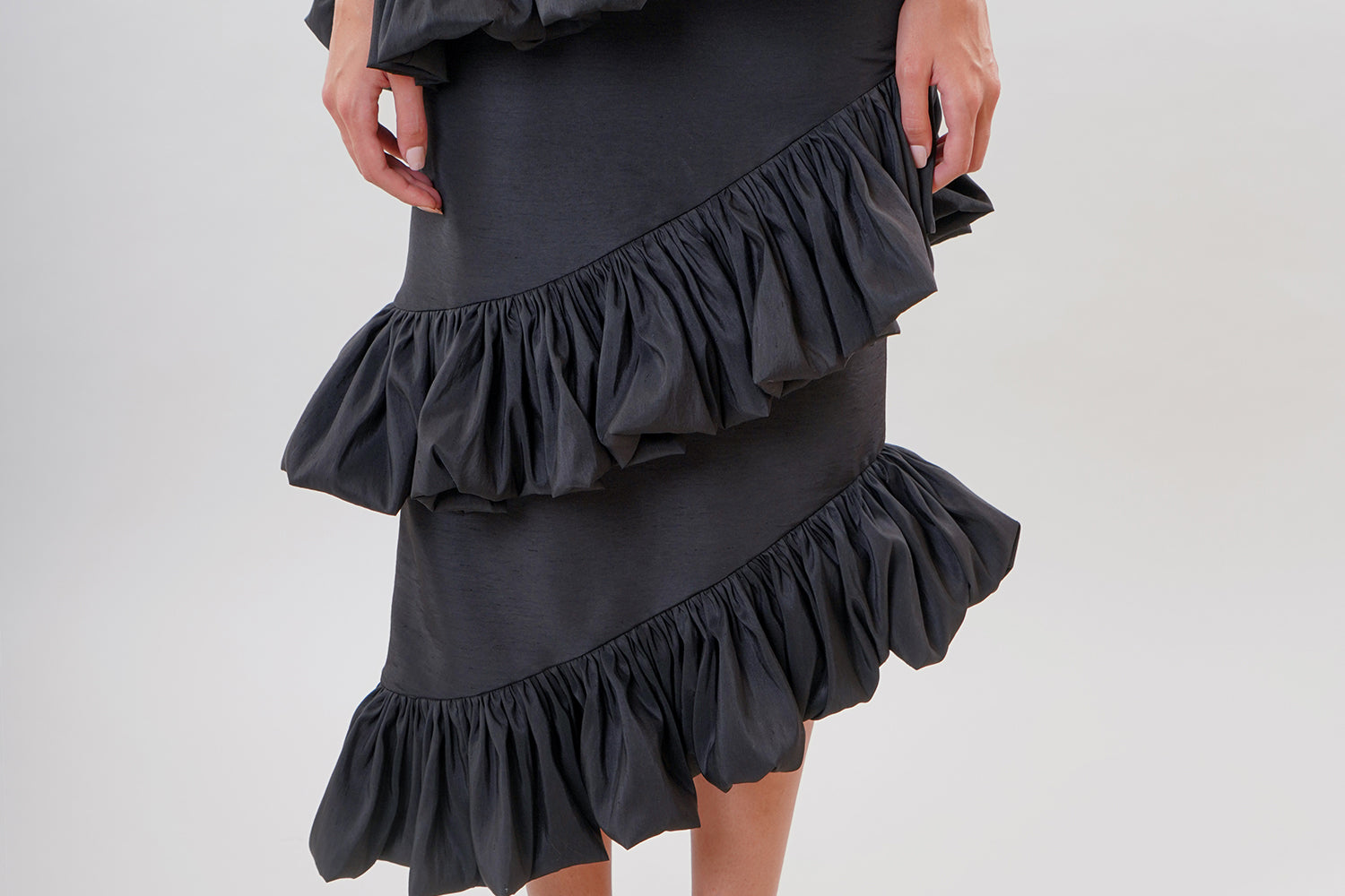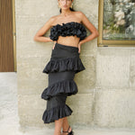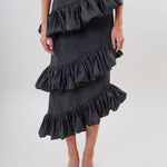 A statement piece like no other. The 'dunes' skirt is a hight-waisted fitted skirt with three layers of gathered ruffles for more fun and flair.