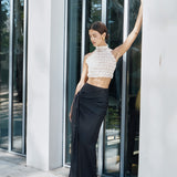 A high-waisted straight silhouette with a draped shawl on the bodice.