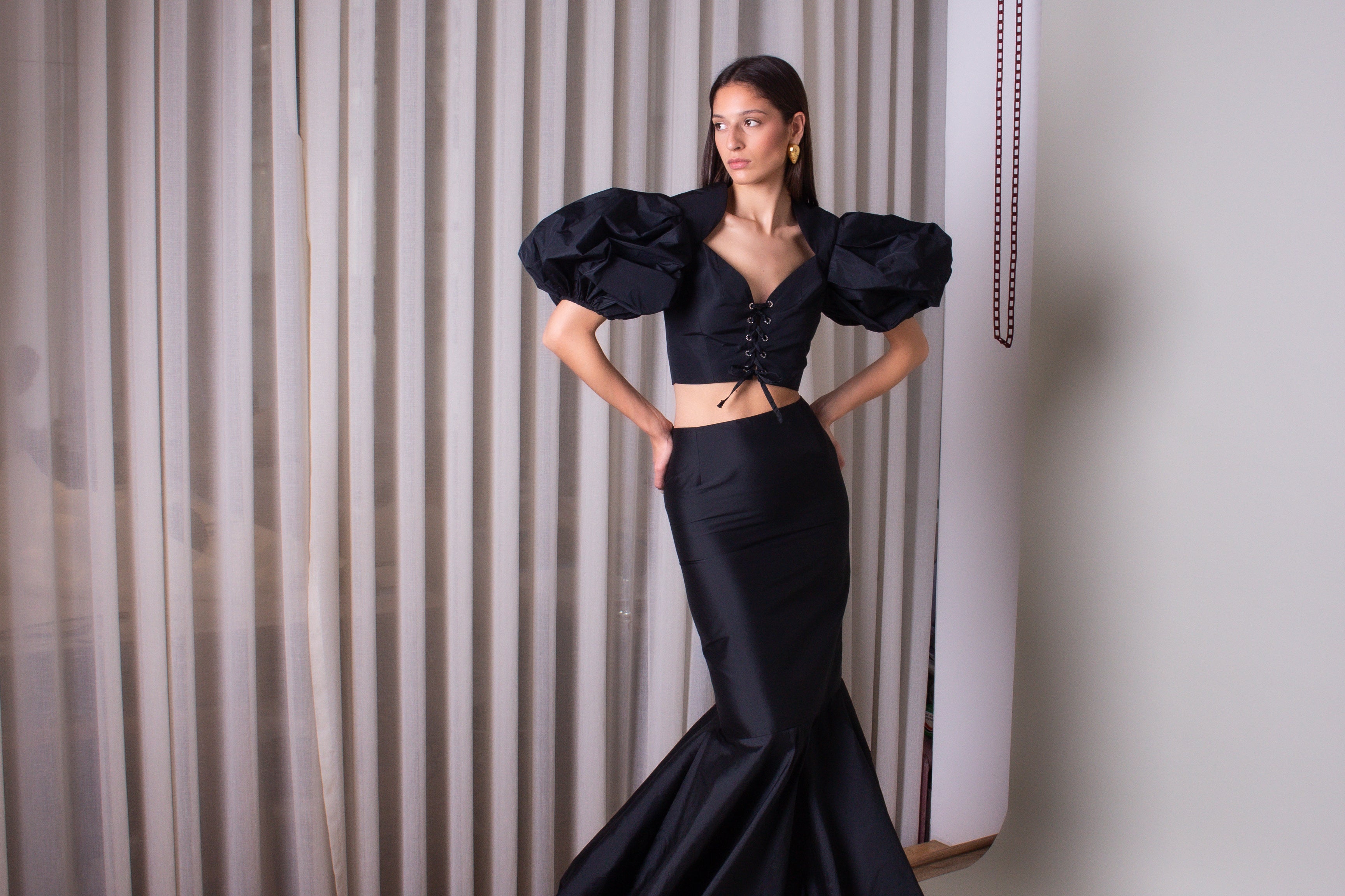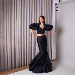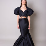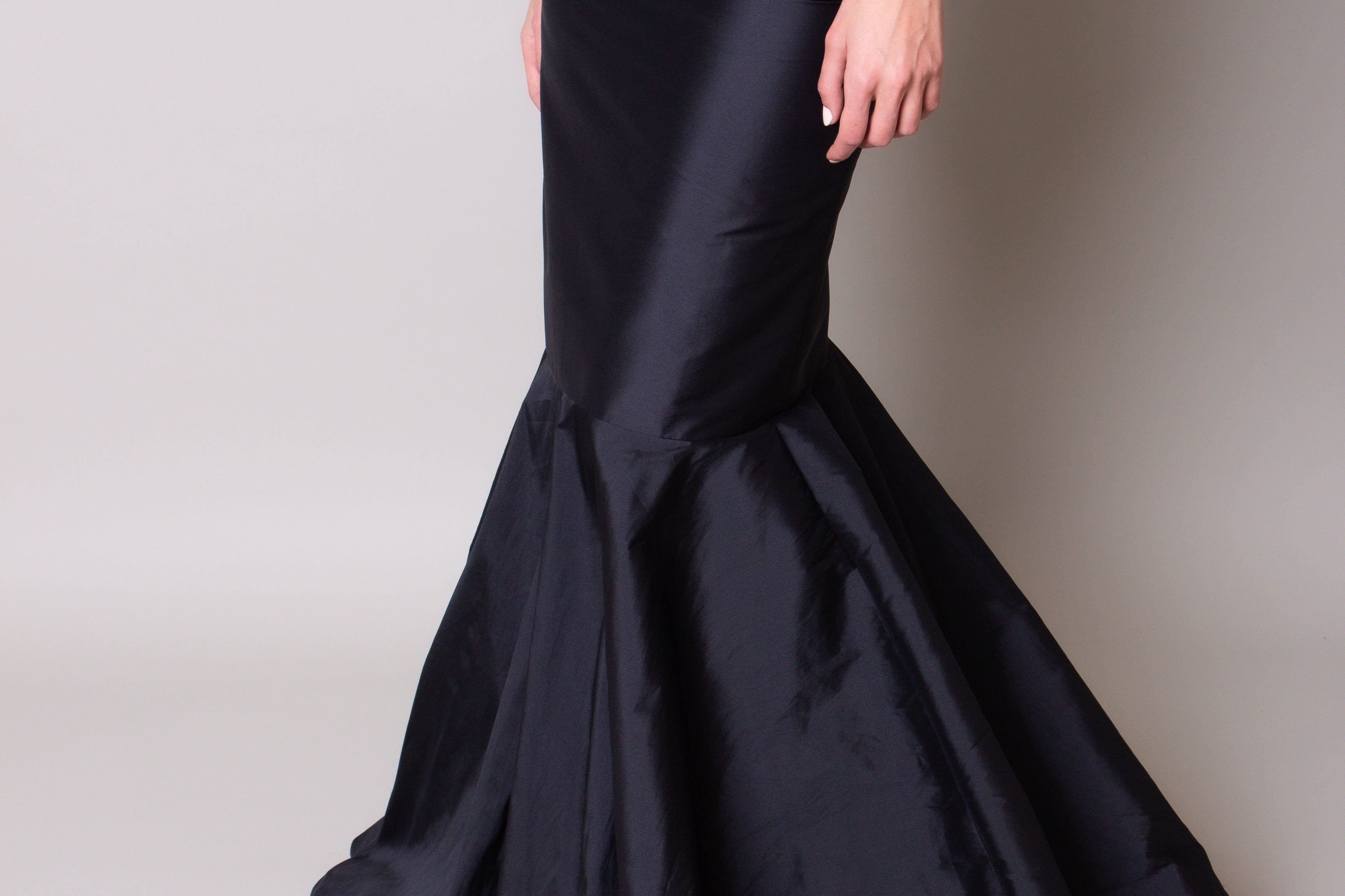 A maxi high-waisted, mermaid cut skirt made with a refined taffeta fabric.