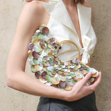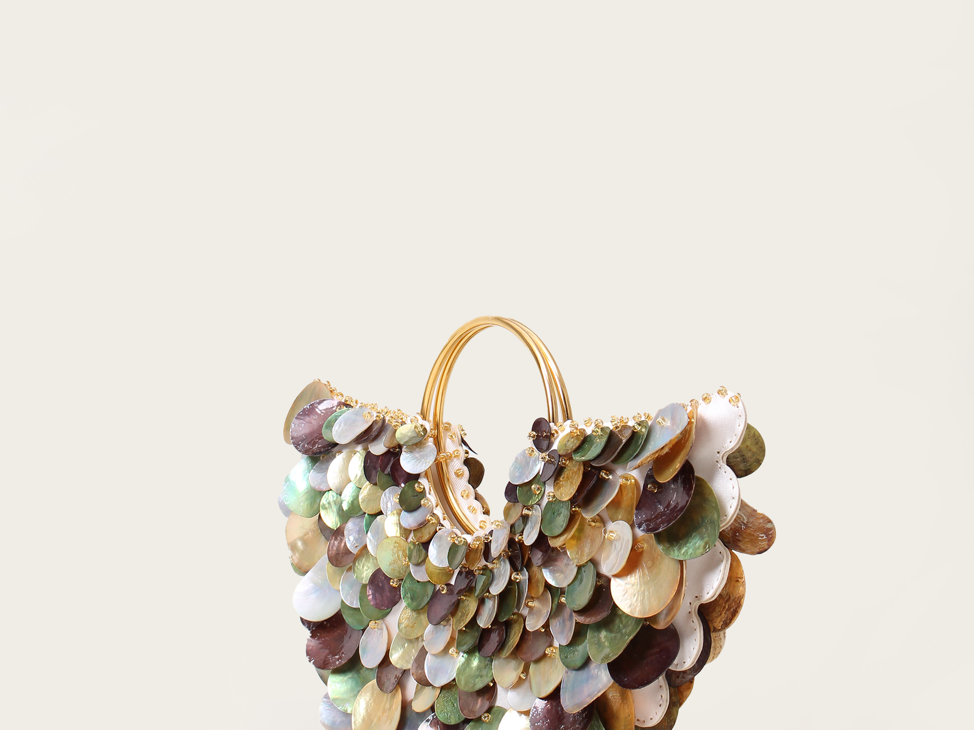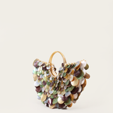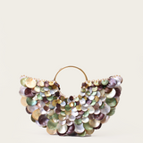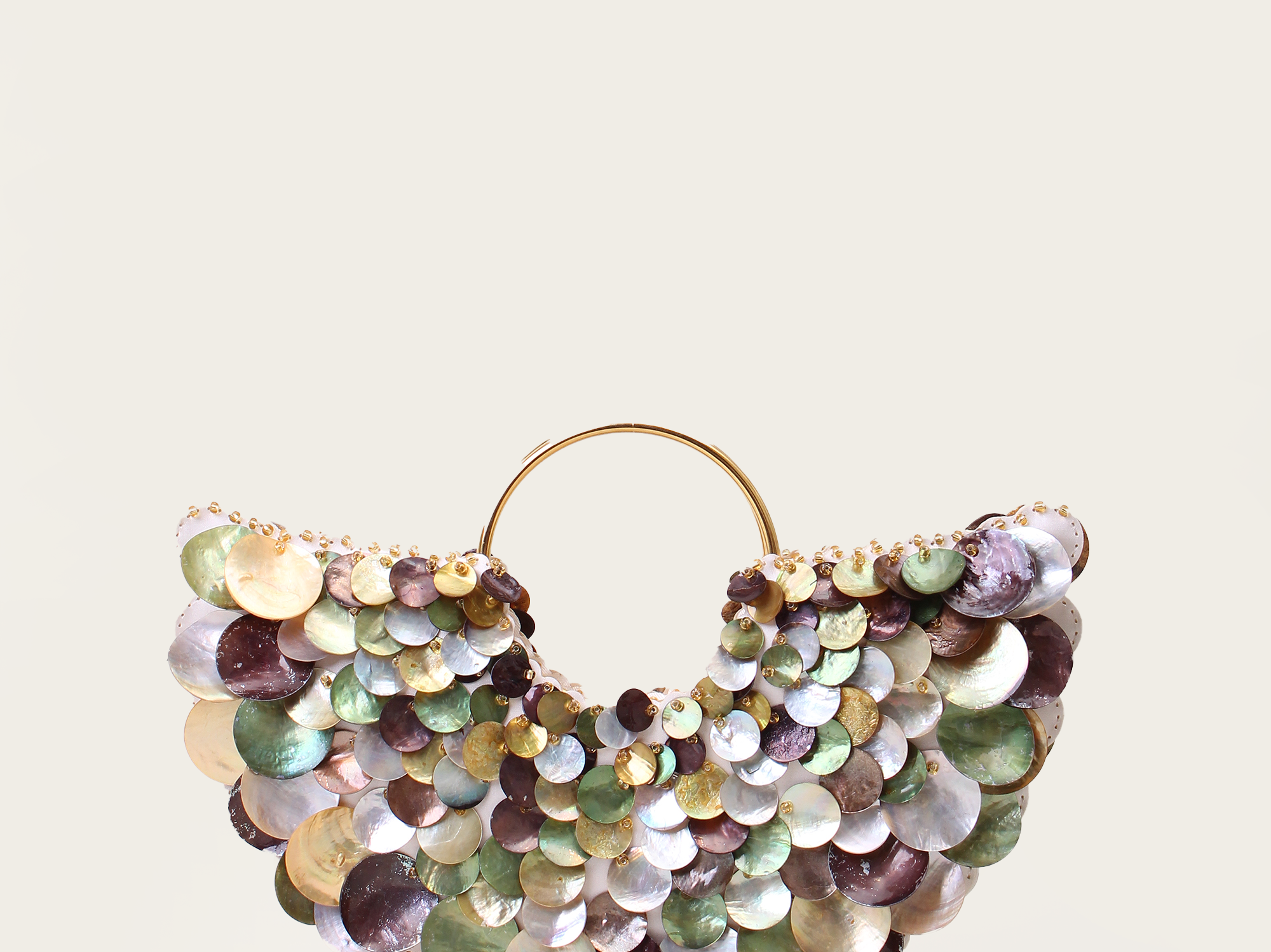 A new summer staple. This fan-shaped design is handcrafted with cascading circular natural shells. It features a gold-plated circular handle for a geometric and structured appearance.