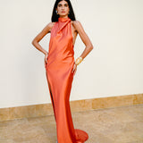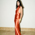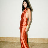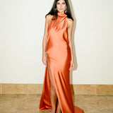 A look that exudes sophistication and allure. The 'Sunset' dress is made from refined satin and features a draped collar and open back, with intricate button detailing across the bodice.