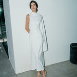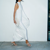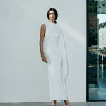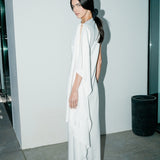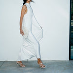 An effortless piece that creates soft flowing movements as you go. It's an ankle-length dress with a high boat neckline and asymmetrical draping on the side.