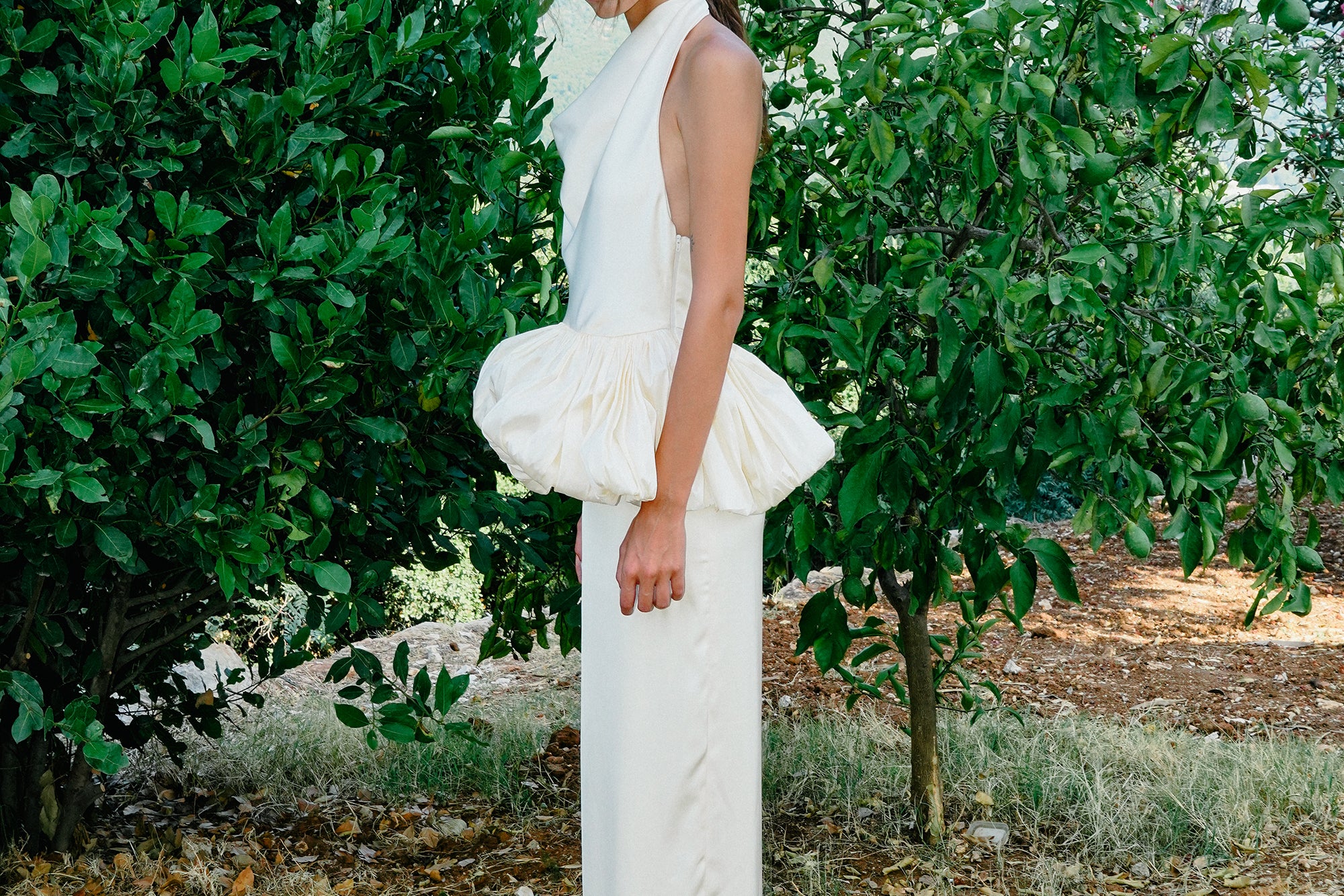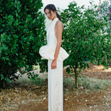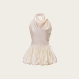 A versatile and fun piece that adds dimension to your outfit. The 'parasol' bustier is a high-neck draped cut with an open back and a ruffled hem