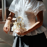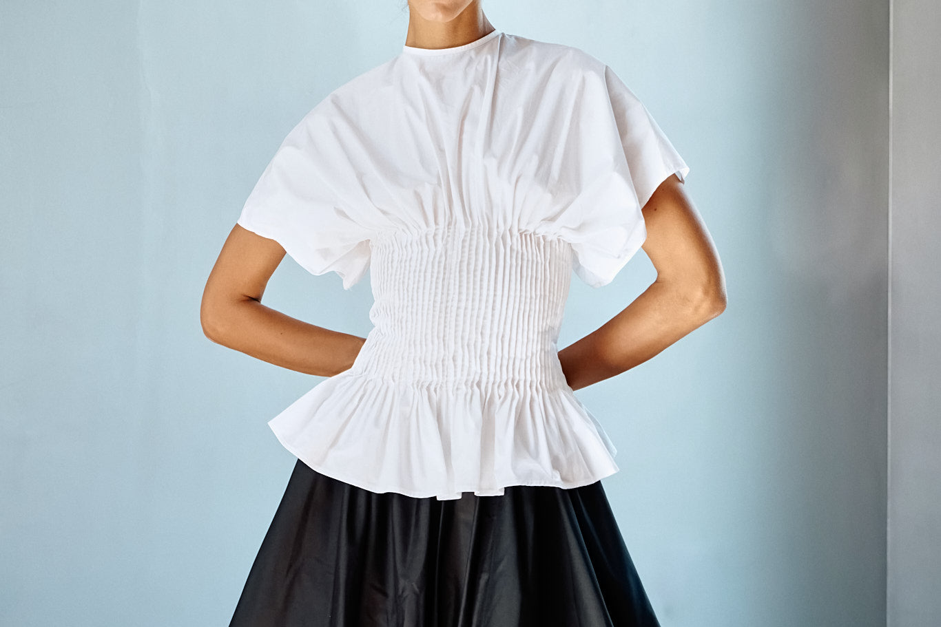 A structured piece that adds an edge to your looks. It features cap-style short sleeves with intricate pin-tuck details at the bodice, with a slight flare at the hem.