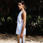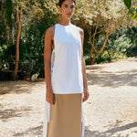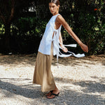 A versatile day-to-night top with a high neck and open sides. They are adorned by two rows of straps that can be tied in a knot.