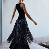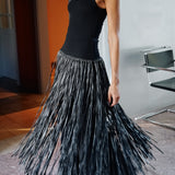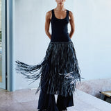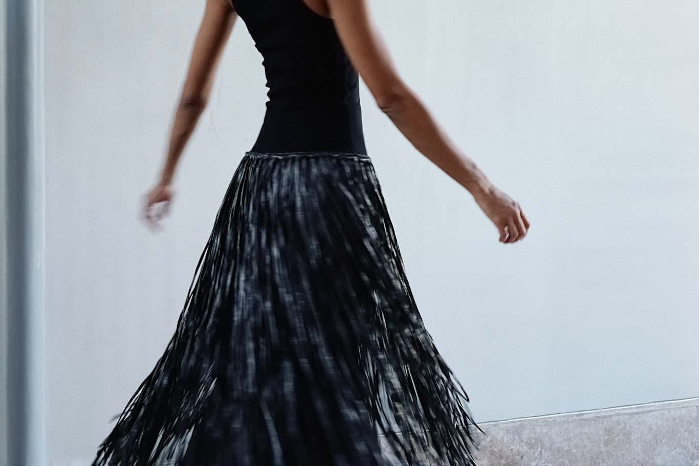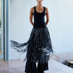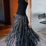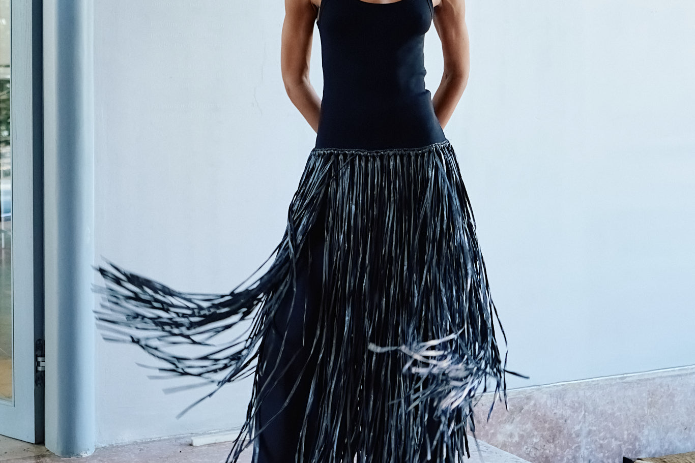 A versatile tank top with a twist. It is adorned with knee-length handcrafted raffia fringes that move with you as you go.