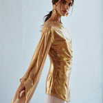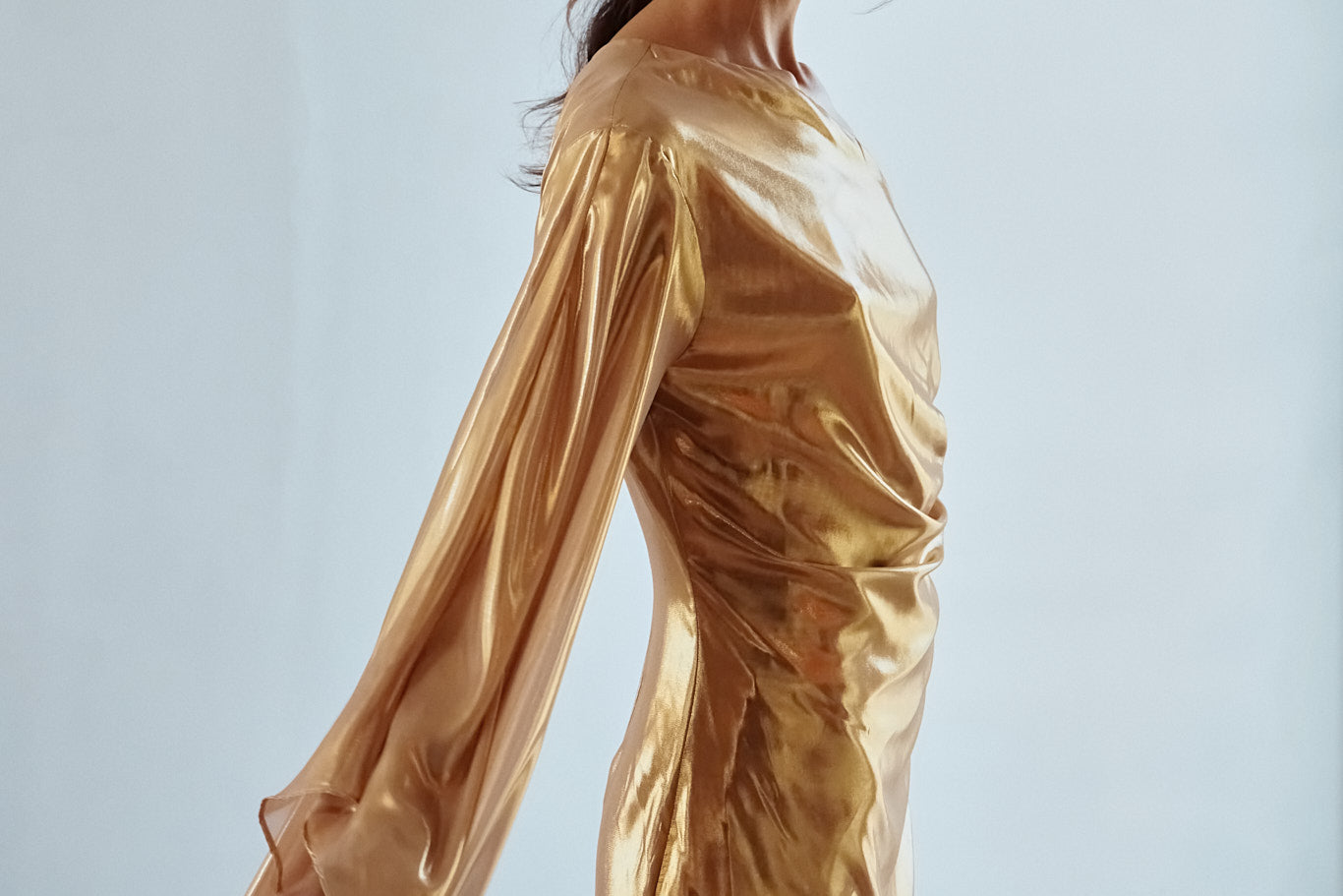 A one-shoulder piece with an exaggerated bell sleeve and rushing detail on the side; designed in a shimmery voile material.