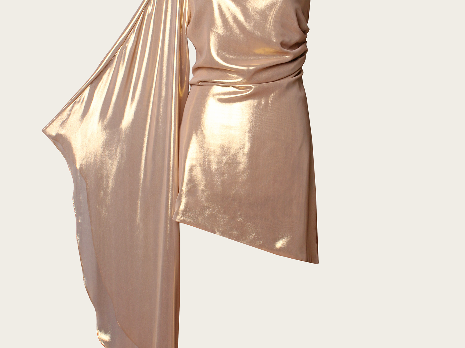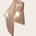 A one-shoulder piece with an exaggerated bell sleeve and rushing detail on the side, designed in a shimmery voile material.