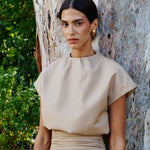 A structured silhouette with exaggerated shoulders and a cropped hem.