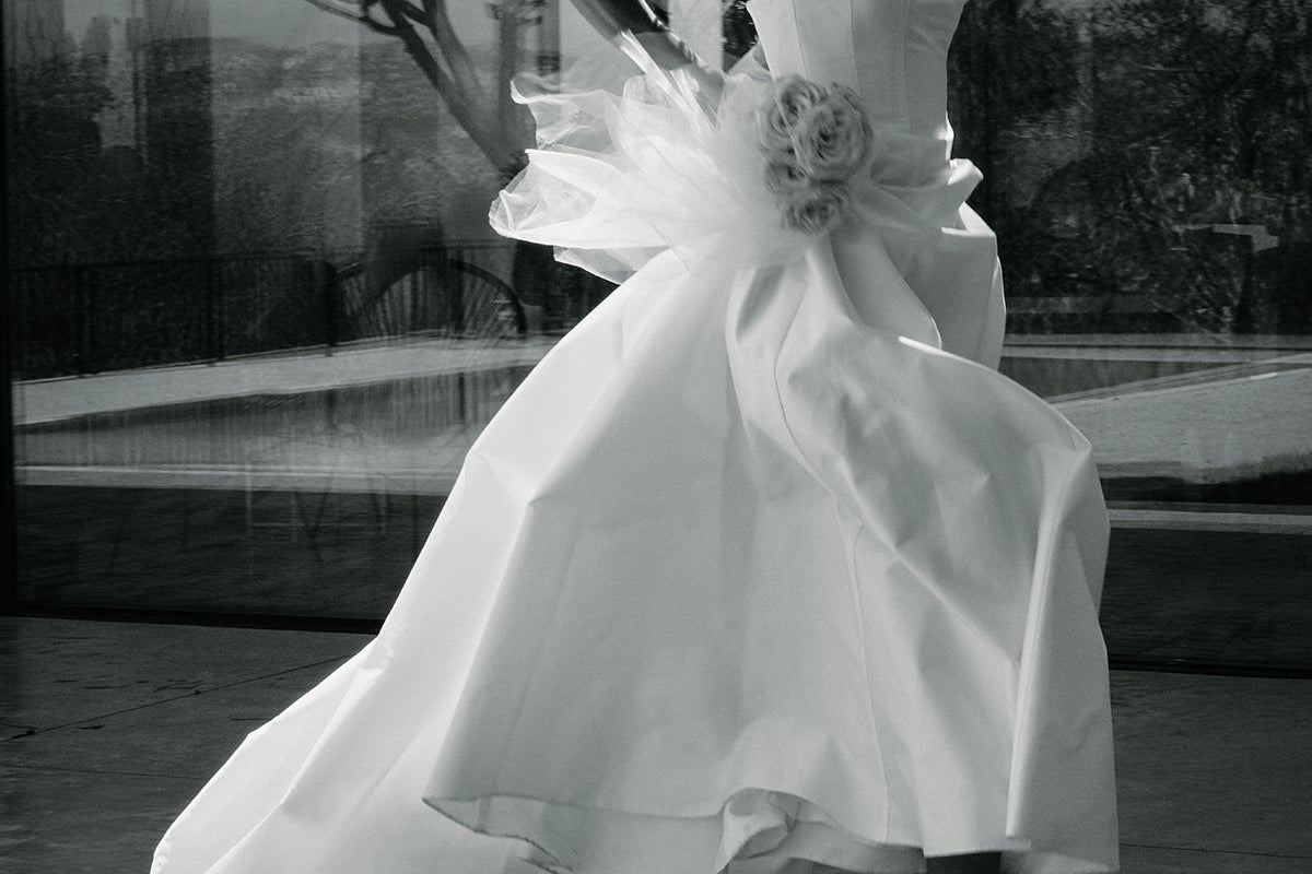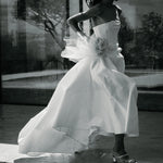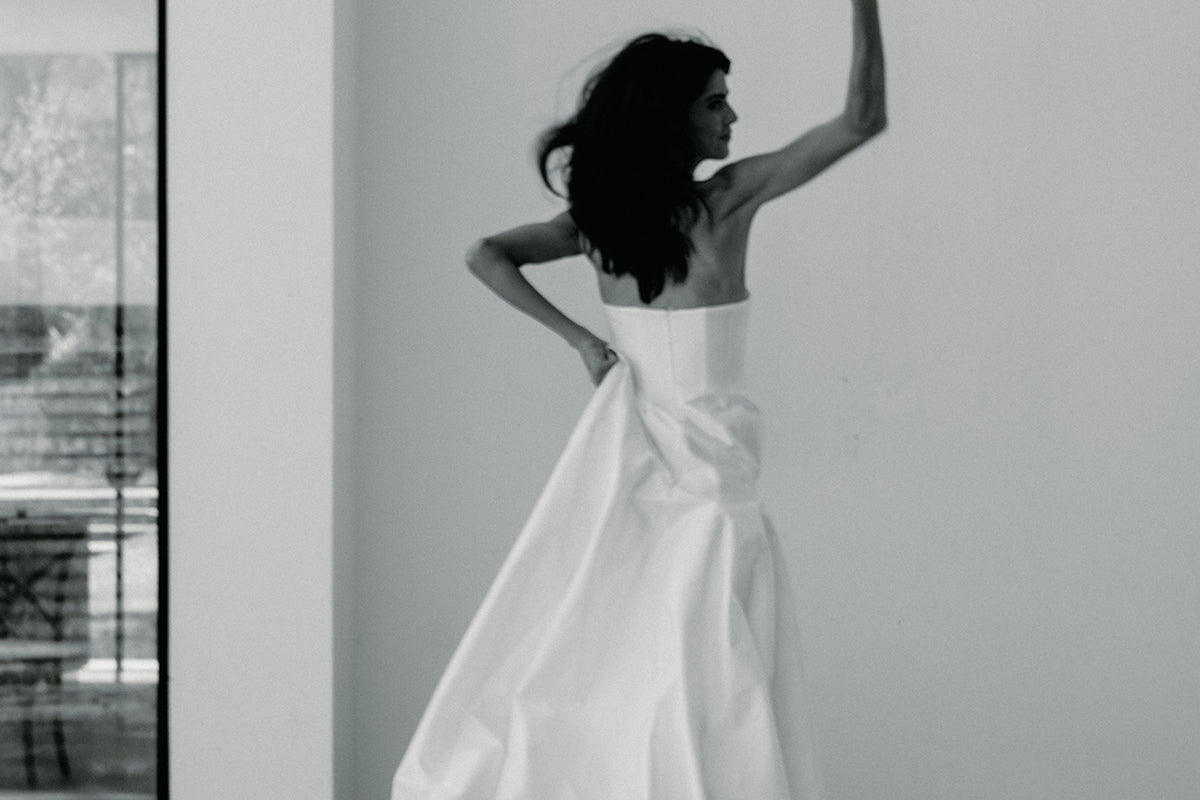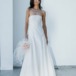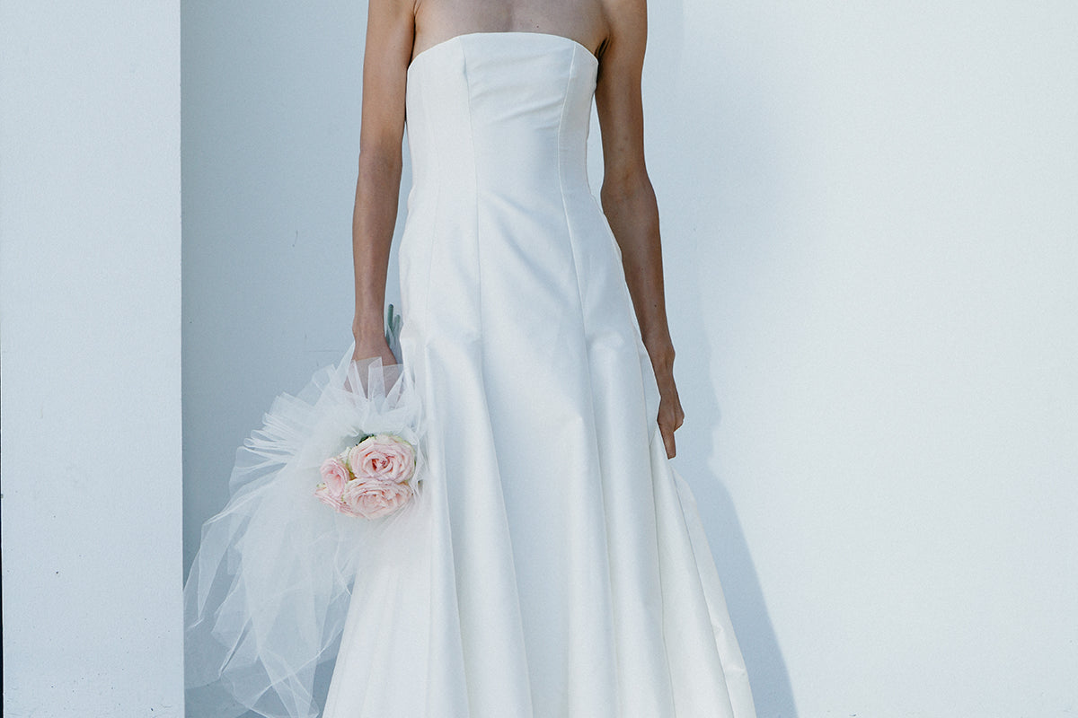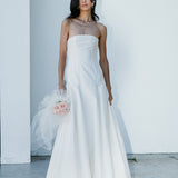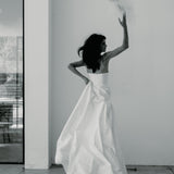 A strapless and structured column gown with front panels. A statement piece that features a ballgown style silhouette with a flattering fitted bodice; An ultimate balance of grace and elegance.