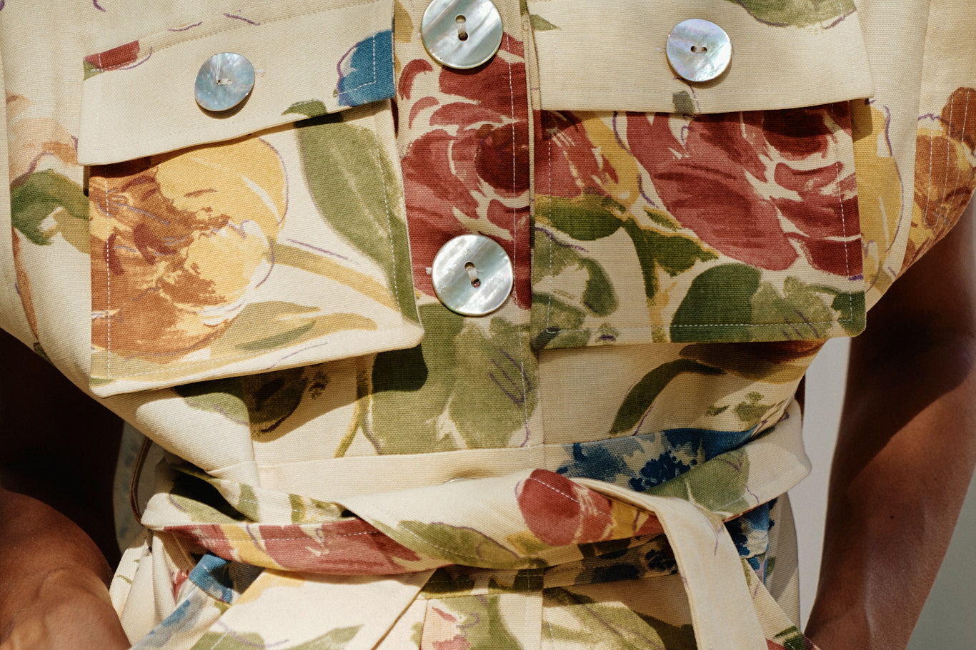 A utility-style vest crafted in a floral pattern that will freshen up your looks. With a pointed collar and two cargo pockets, this piece is adorned with oversized mother-of-pearl buttons,